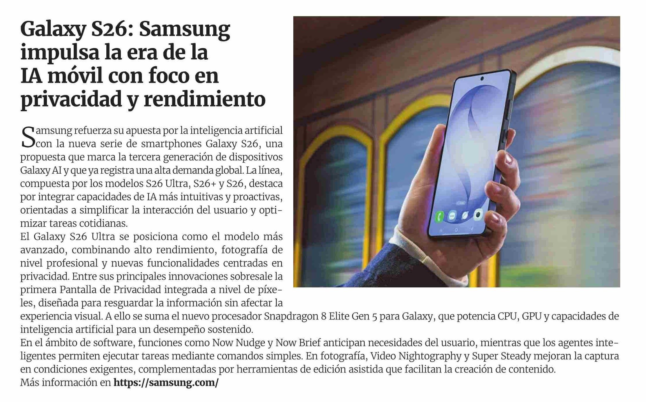 | Título: | Galaxy S26: Samsung impulsa la era de la IA móvil con foco en privacidad y rendimiento |