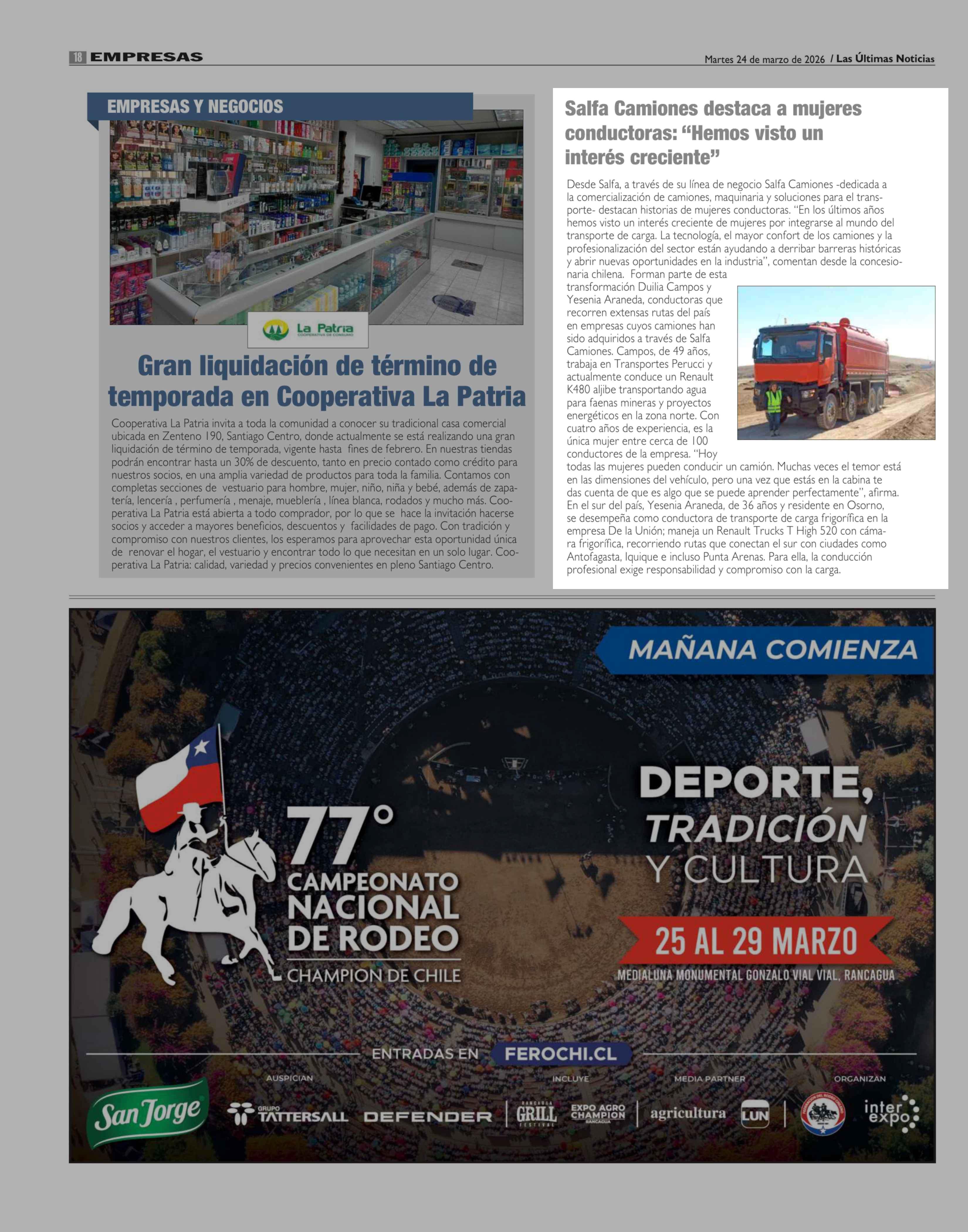 Salfa Camiones destaca a mujeres conductoras: "Hemos visto un interés creciente" 24-03-2026 Las Últimas Noticias |