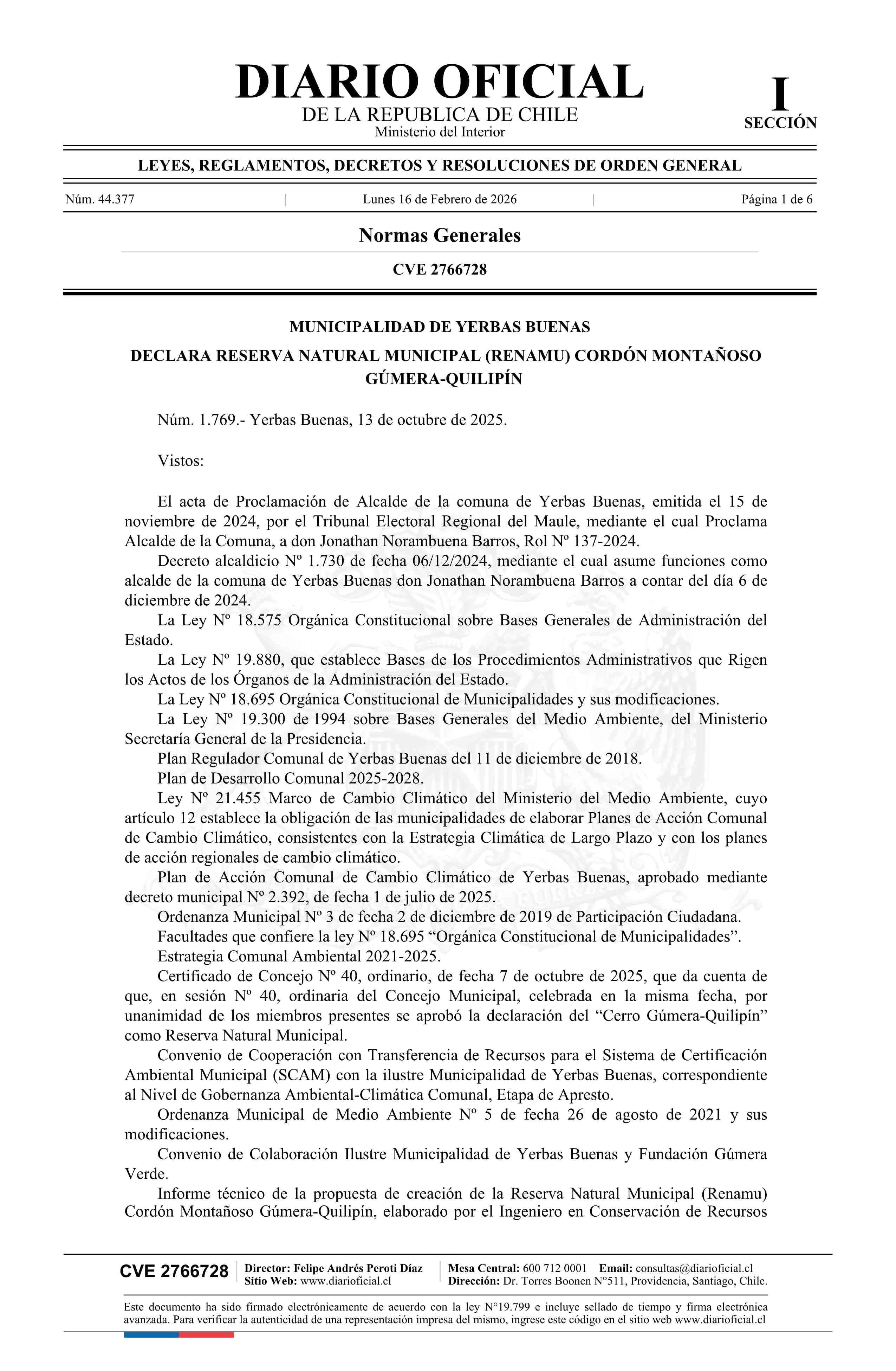 Título: Decreto alcaldicio número 1.769, de 2025.- Declara Reserva Natural Municipal (Renamu) Cordón Montañoso Gúmera-Quilipín