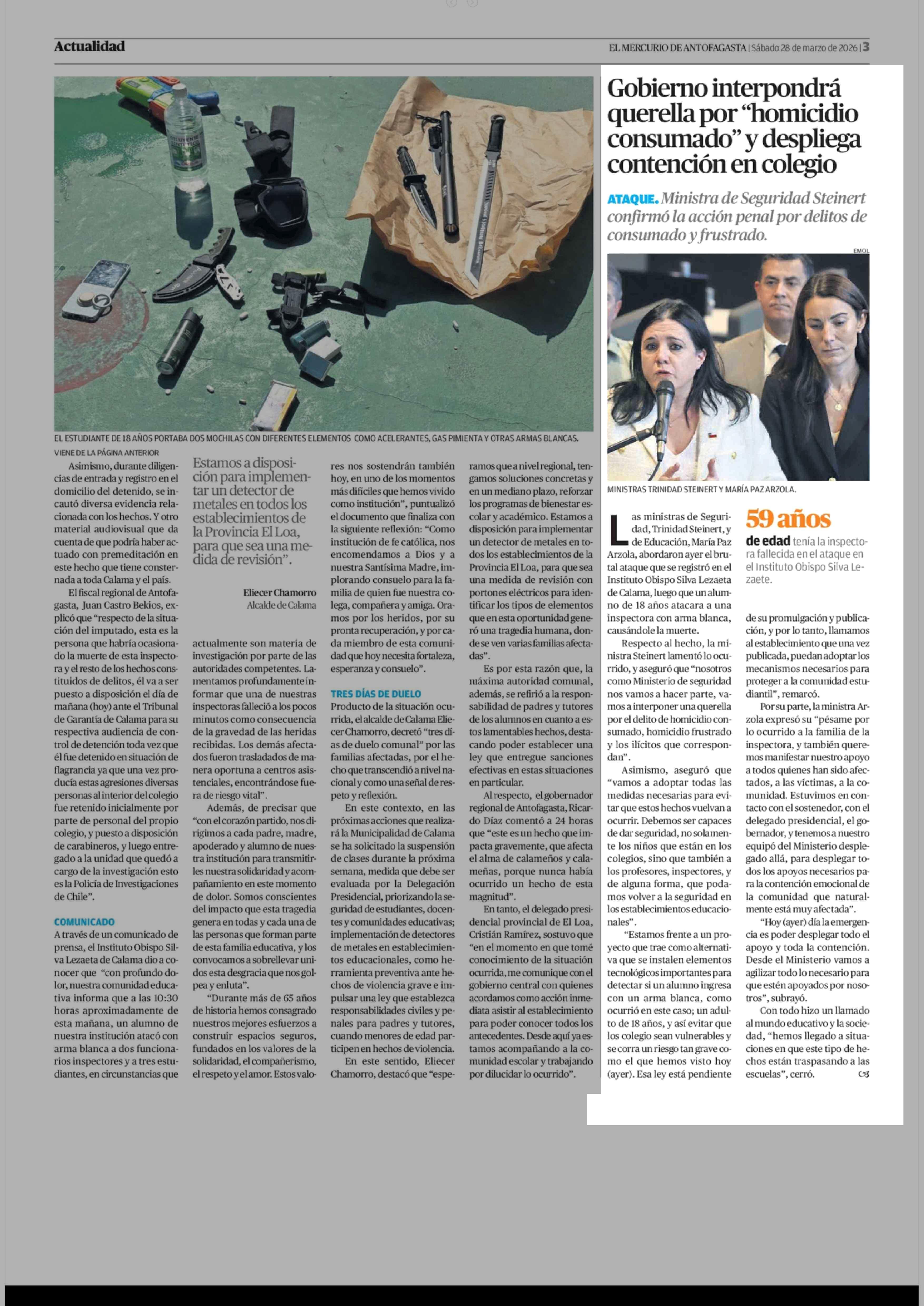 Gobierno interpondrá querella por "homicidio contención en colegio 28-03-2026 El Mercurio de Antofagasta |