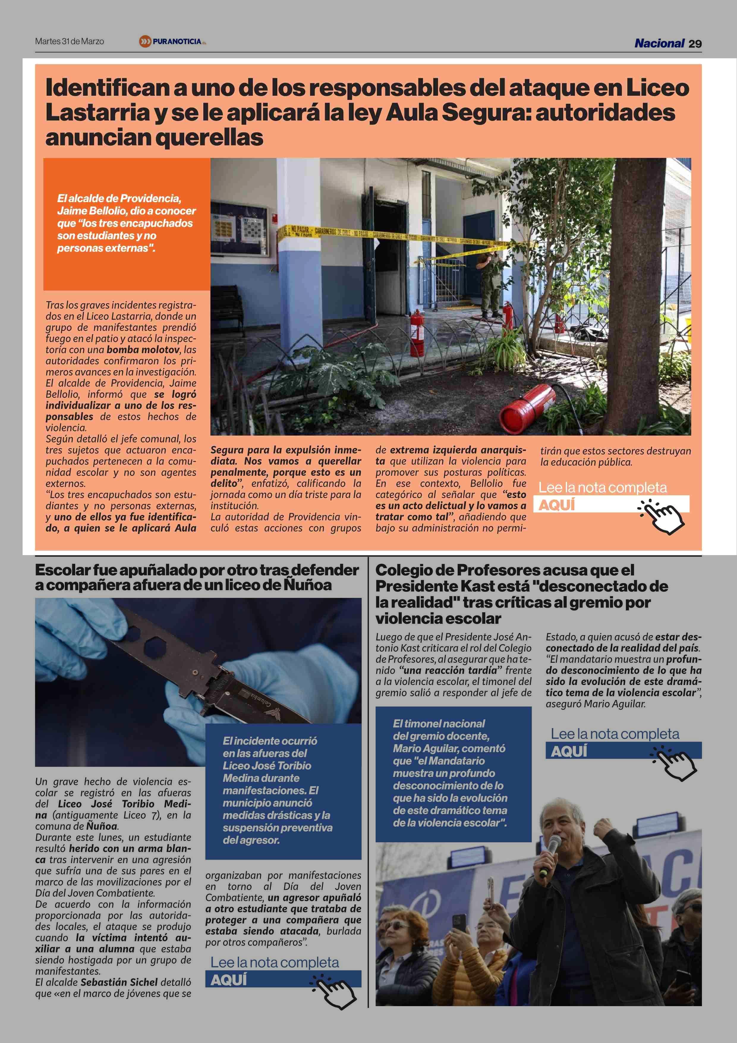 Identifican a uno de los responsables del ataque en Liceo Lastarria y se le aplicará la ley Aula Segura: autoridades anuncian querellas 31-03-2026 Puranoticia.cl |