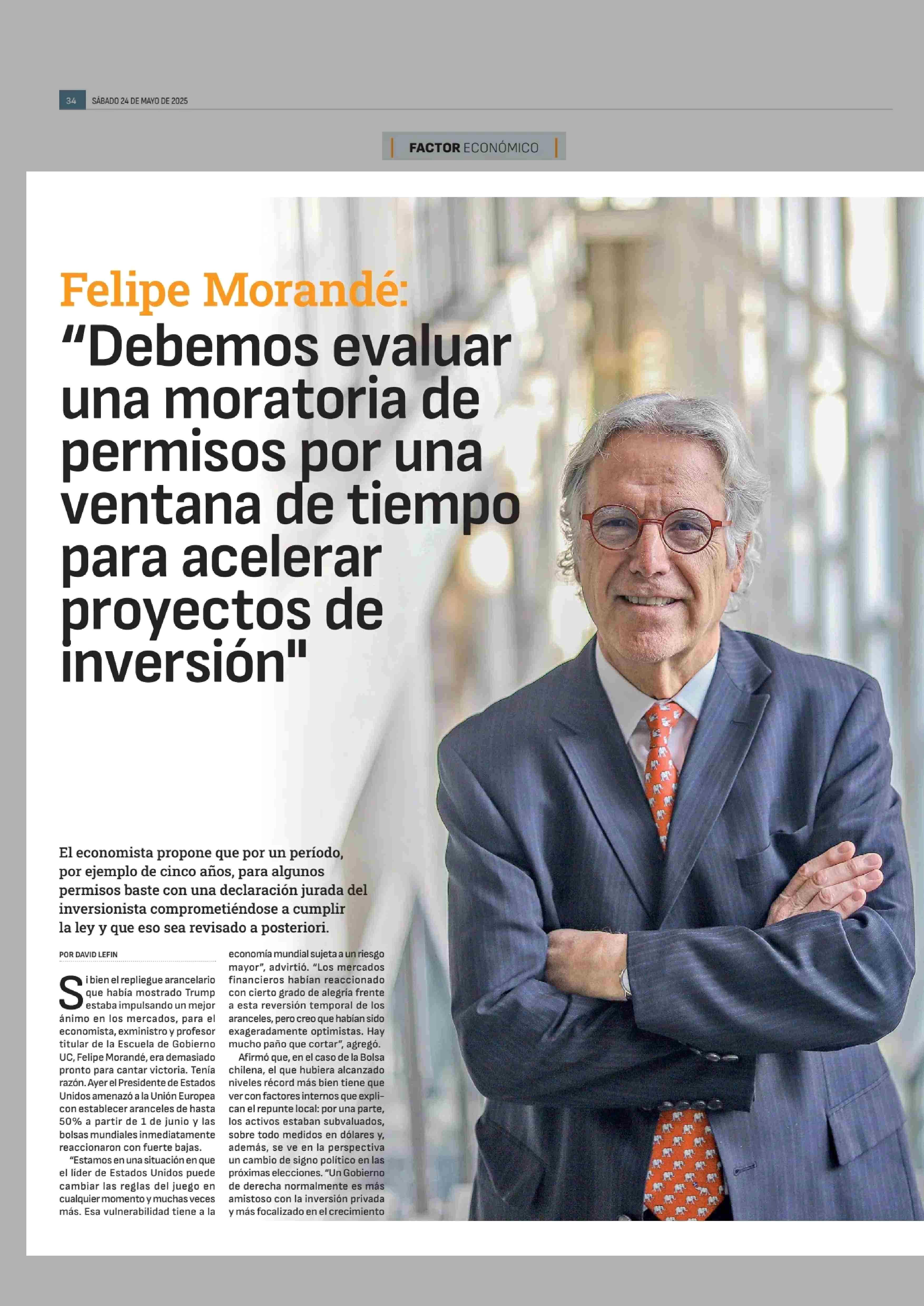 Felipe Morande: “Debemos evaluar una moratoria de permisos por una ventana de tiempo para acelerar proyectos de Inversión” 24-05-2025 Diario Financiero |