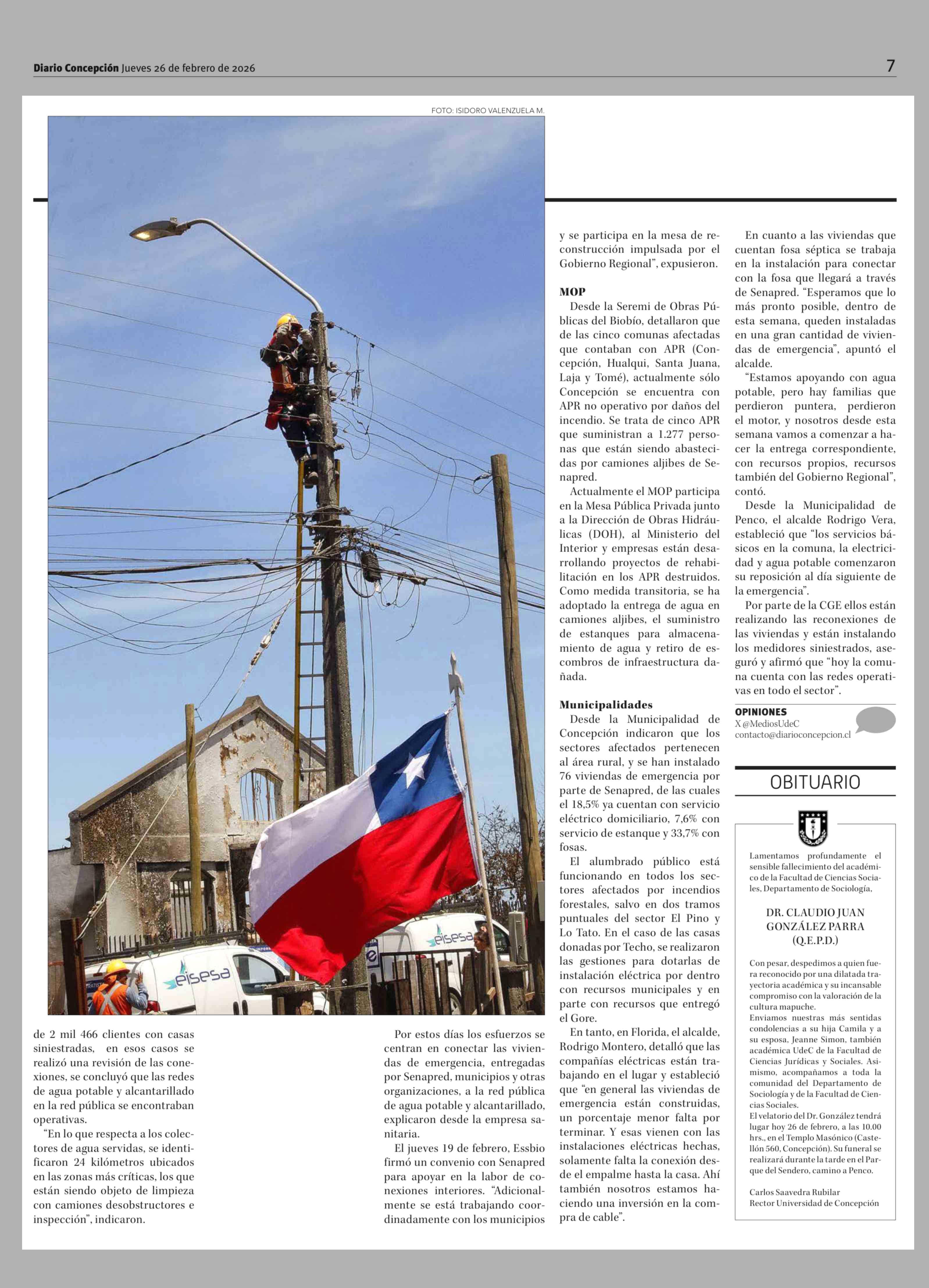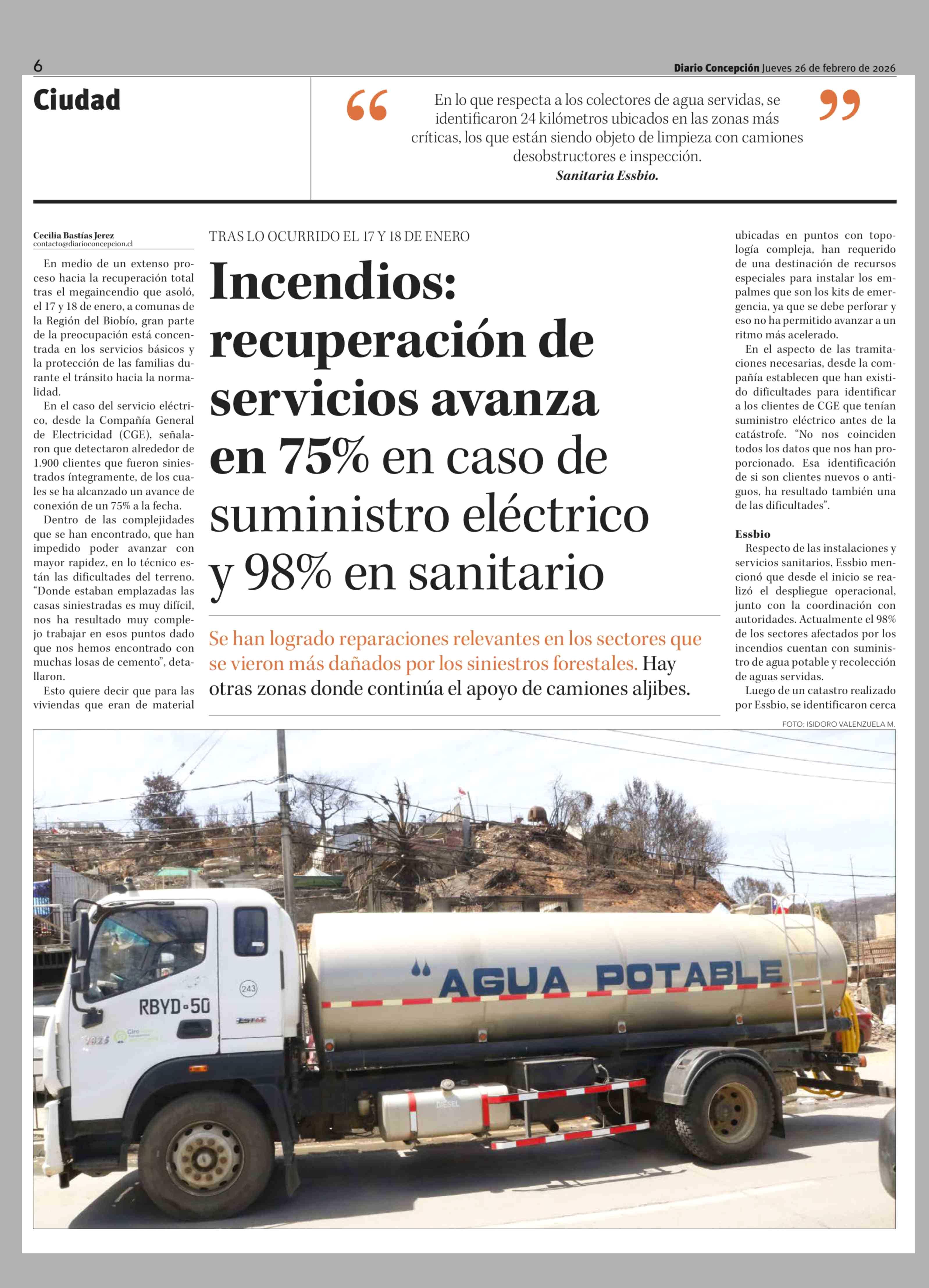 Incendios: recuperación de servicios avanza en 75% en caso de suministro eléctrico y 98% en sanitario 26-02-2026 Diario Concepción |