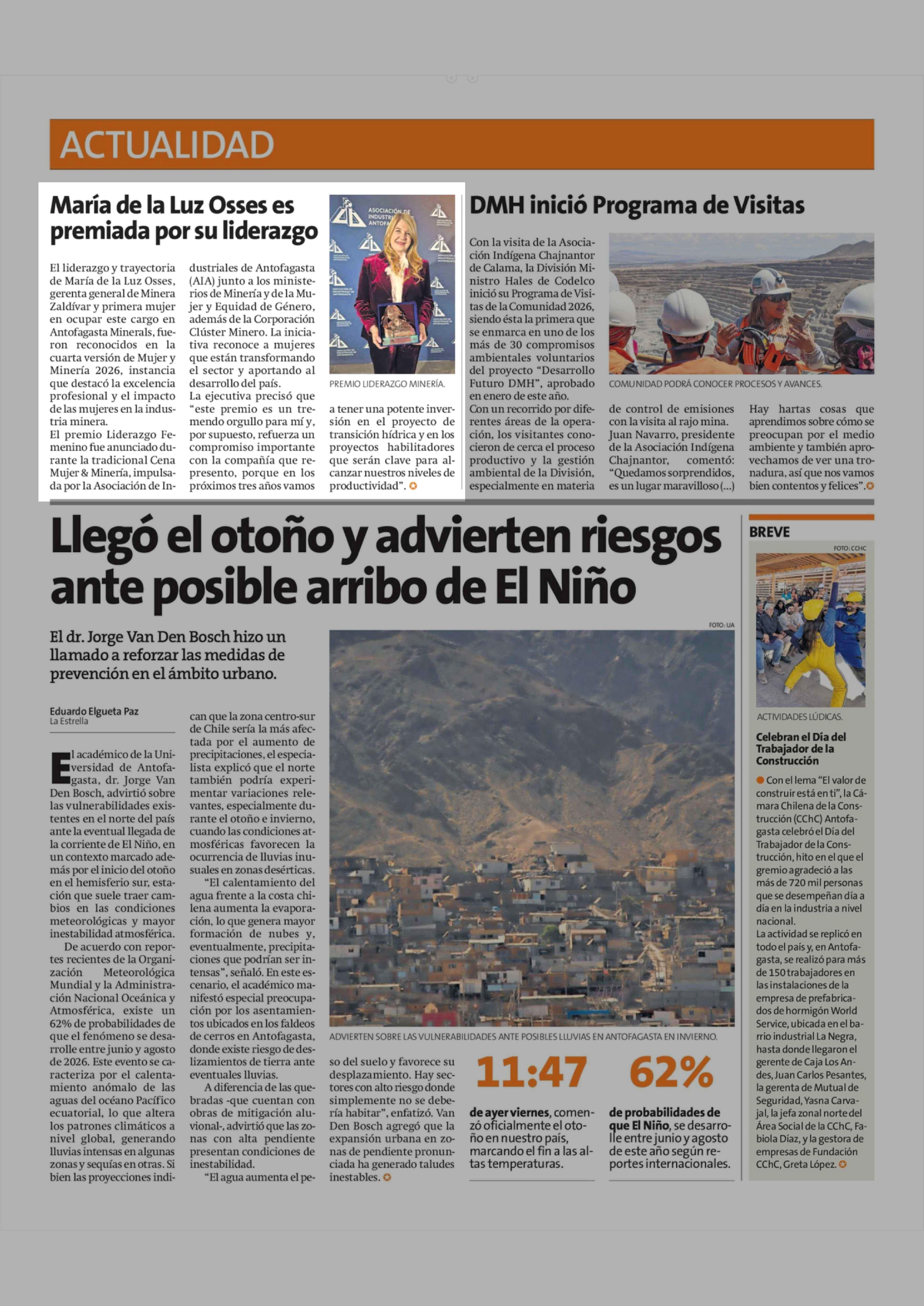 María de la Luz Osses es premiada por su liderazgo 21-03-2026 La Estrella de Antofagasta |