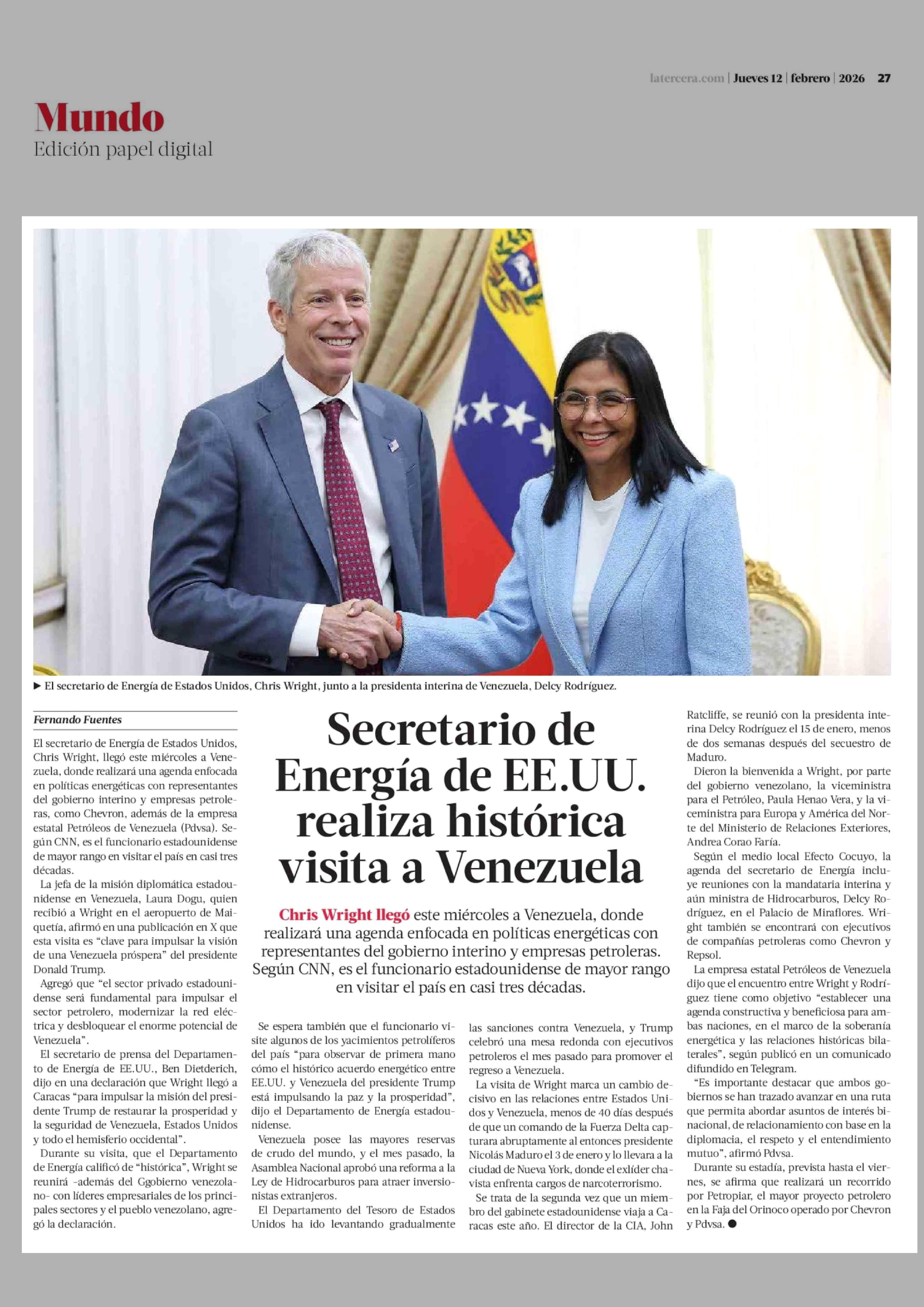 Secretario de Energía de EE.UU. realiza histórica visita a Venezuela 12-02-2026 La Tercera |