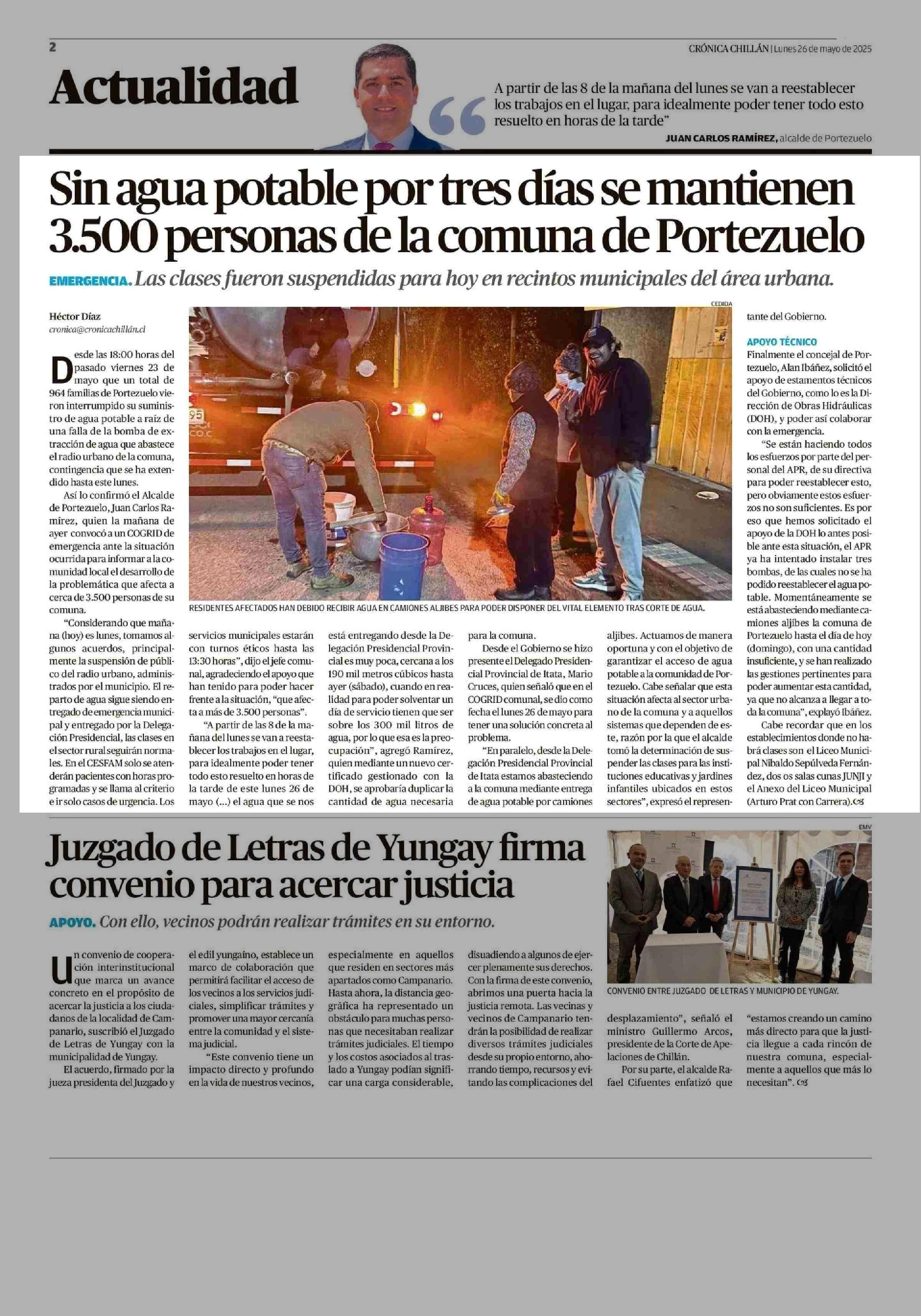 Sin agua potable por tres días se mantienen 3.500 personas de la comuna de Portezuelo 26-05-2025 Crónica de Chillán |
