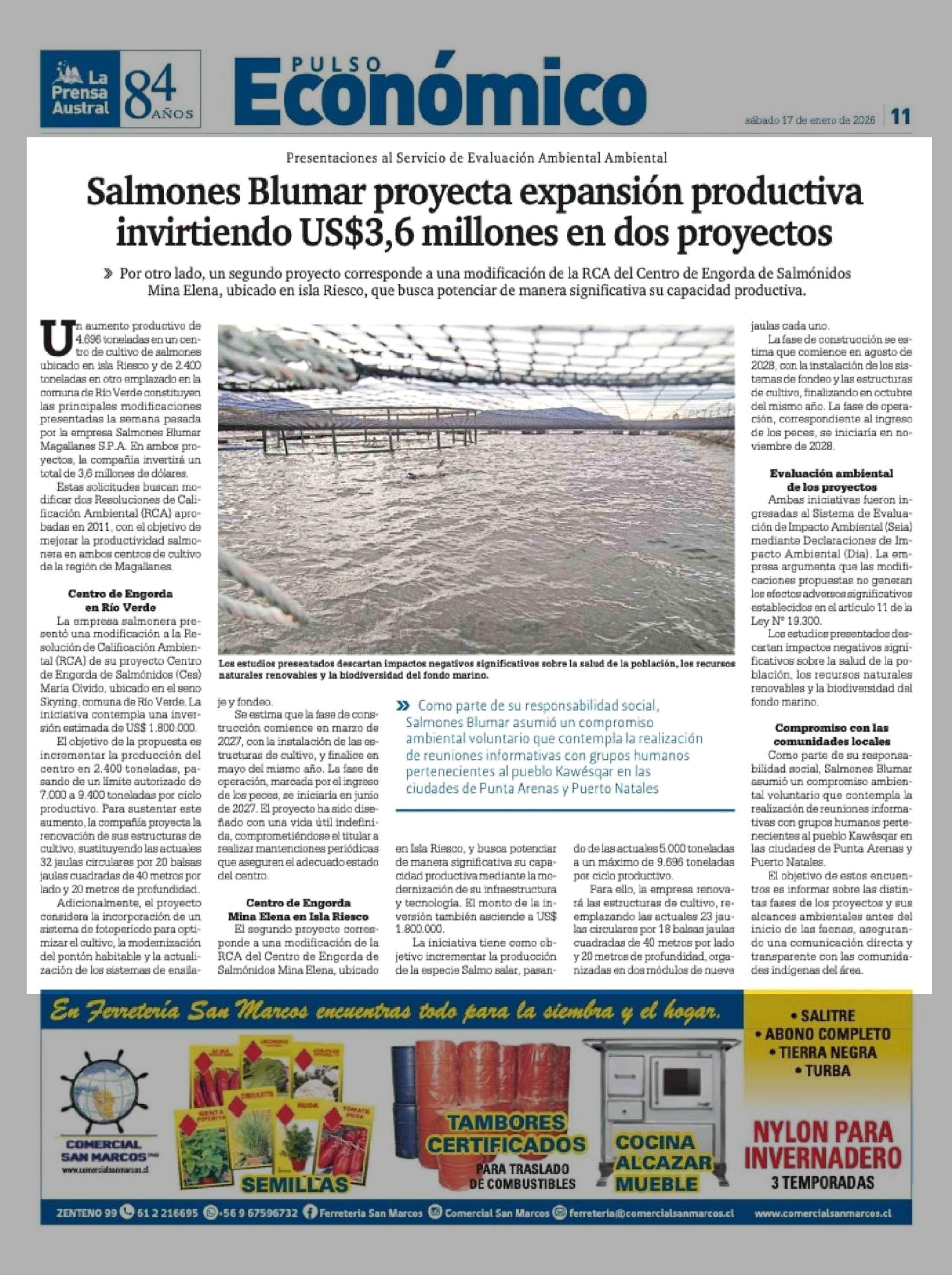 Título: Salmones Blumar proyecta expansión productiva invirtiendo US$3,6 millones en dos proyectos