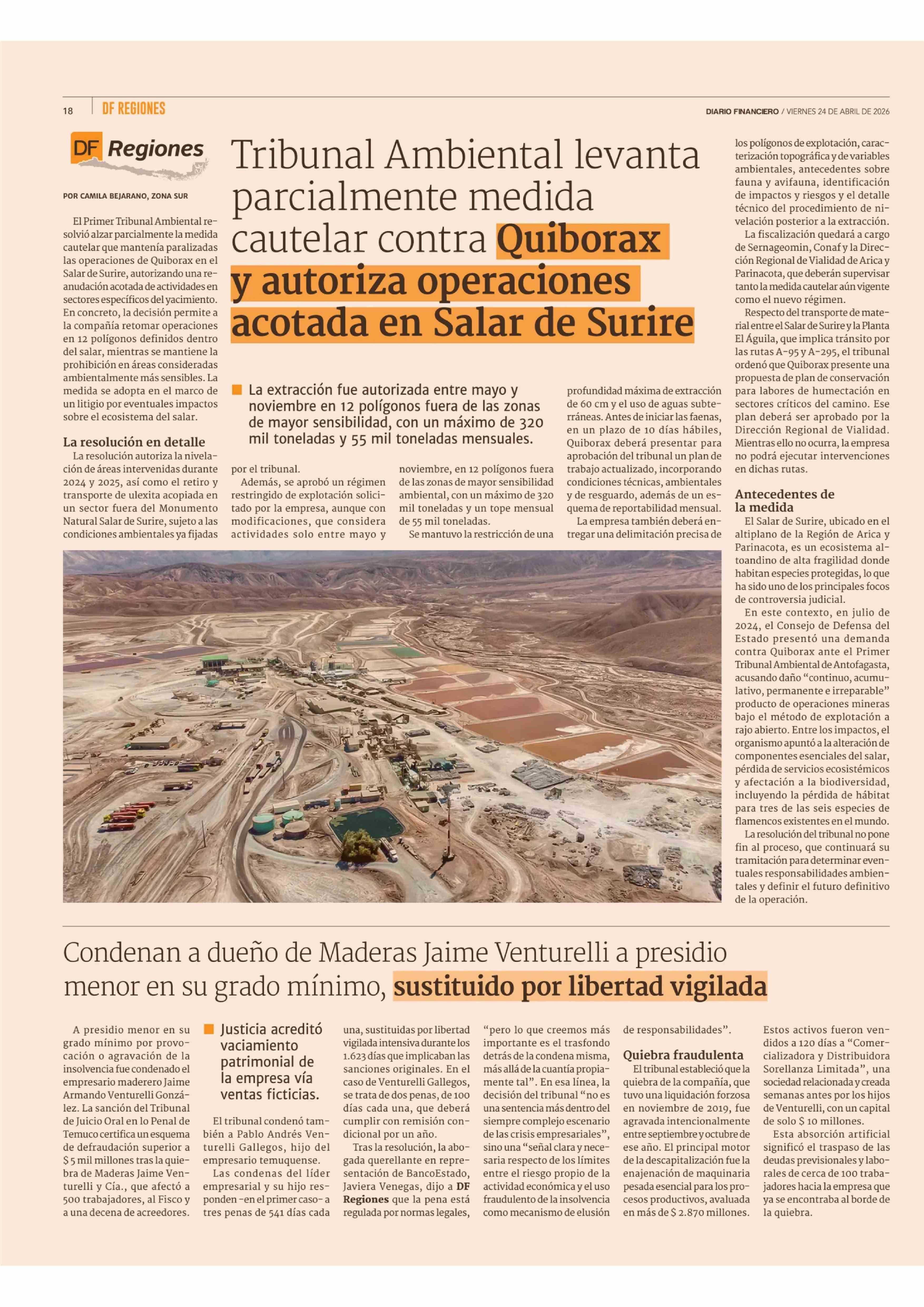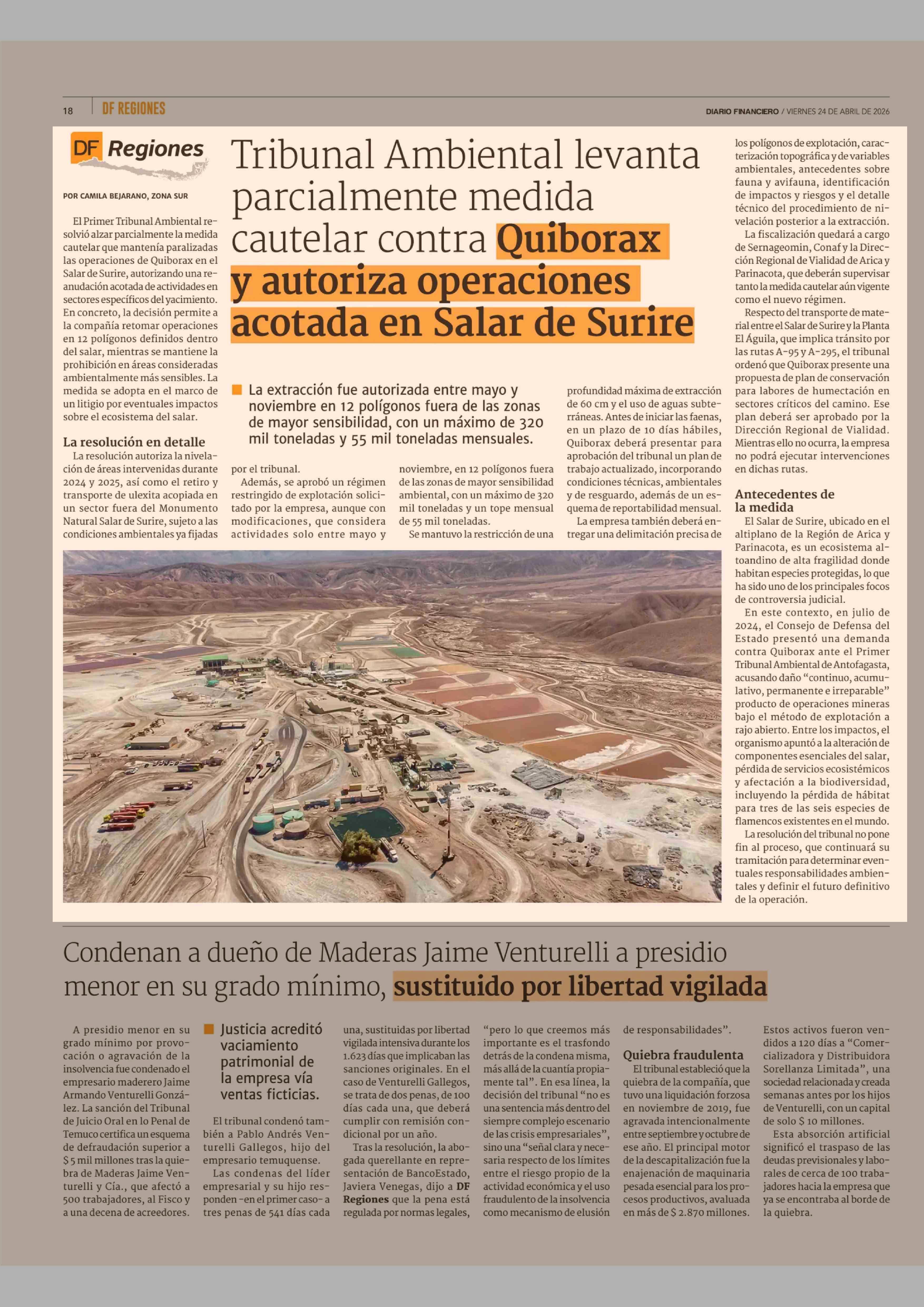 Tribunal Ambiental levanta parcialmente medida cautelar contra Quiborax y autoriza operaciones acotada en Salar de Surire 24-04-2026 Diario Financiero |