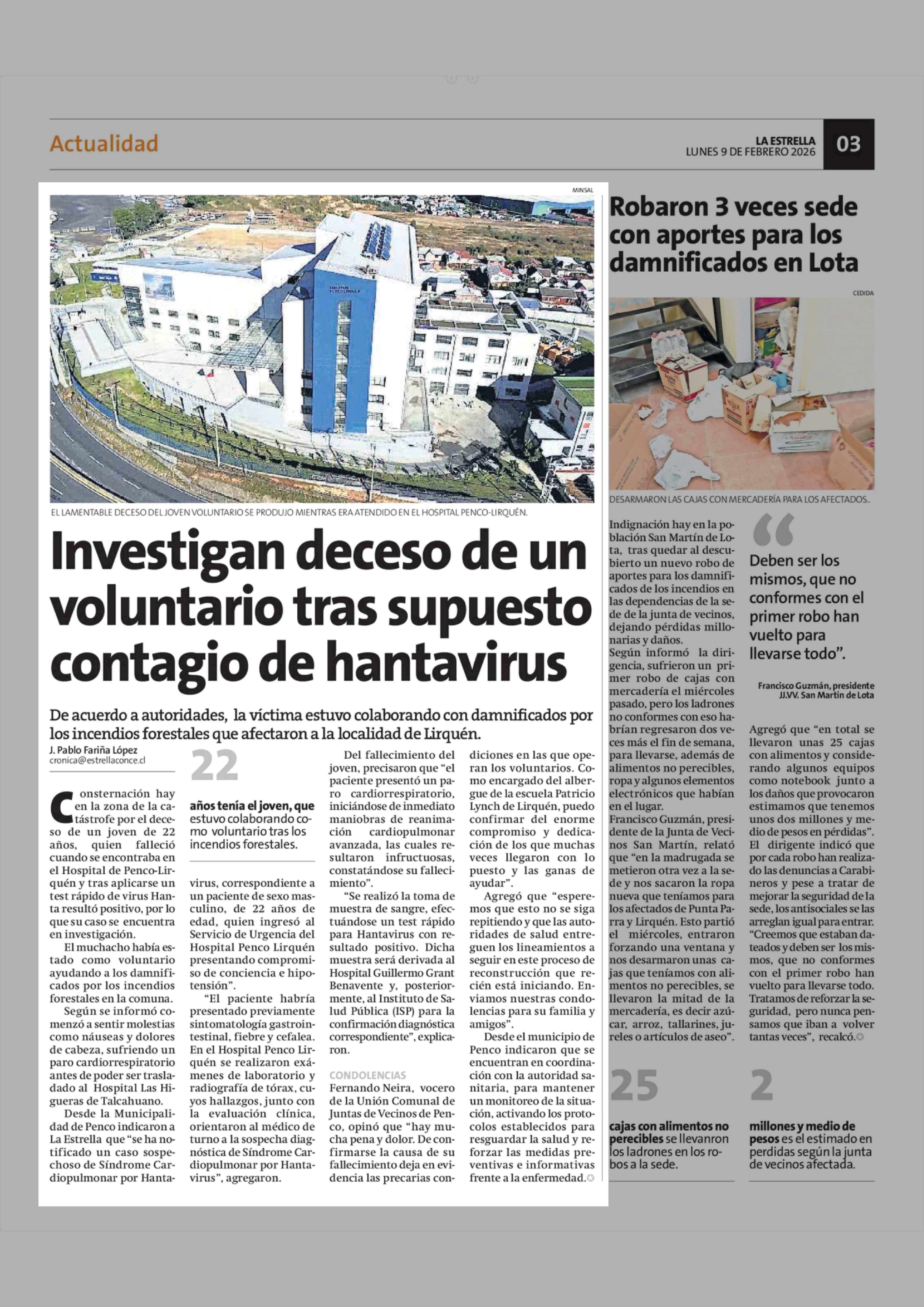 Título: Investigan deceso de un voluntario tras supuesto contagio de hantavirus