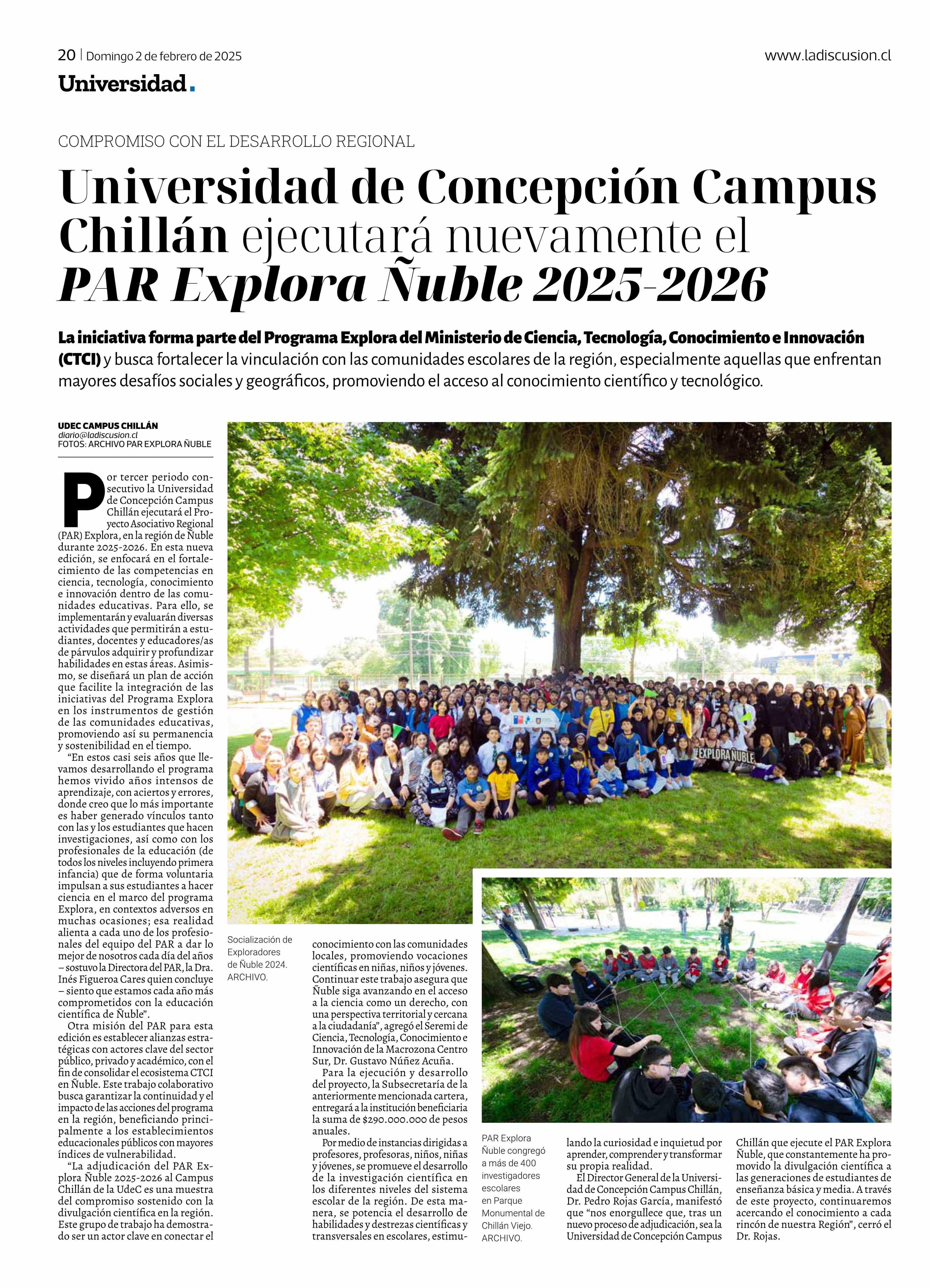 Universidad de Concepción Campus Chillán ejecutará nuevamente el PAR Explora Ñuble 2025-2026 02-02-2025 La Discusión |
