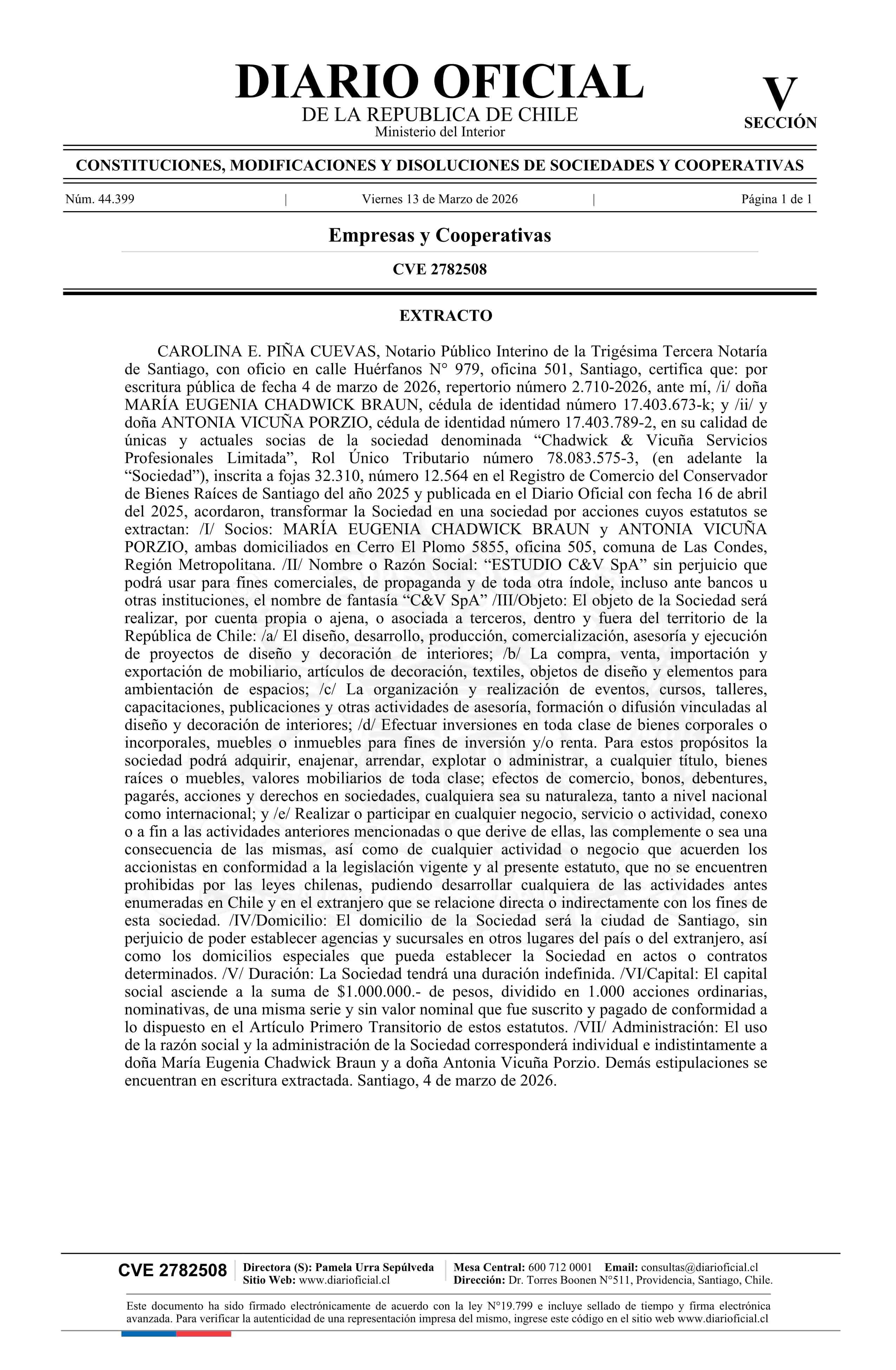 Chadwick & Vicuña Servicios Profesionales Limitada 78.083.575-3* 13-03-2026 Diario Oficial Edición Electrónica |