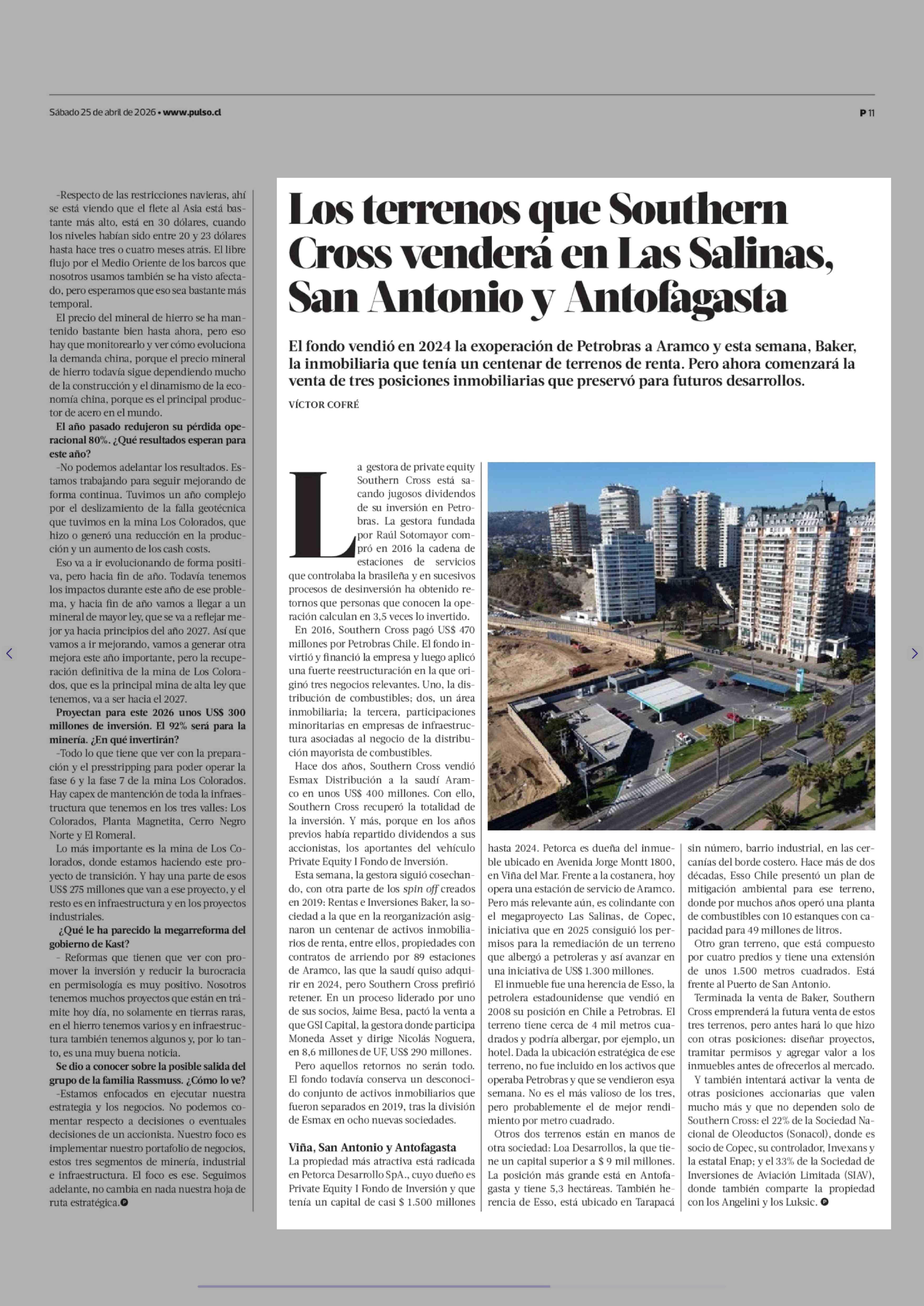 Los terrenos que Southern Cross venderá en Las Salinas, San Antonio y Antofagasta 25-04-2026 La Tercera |