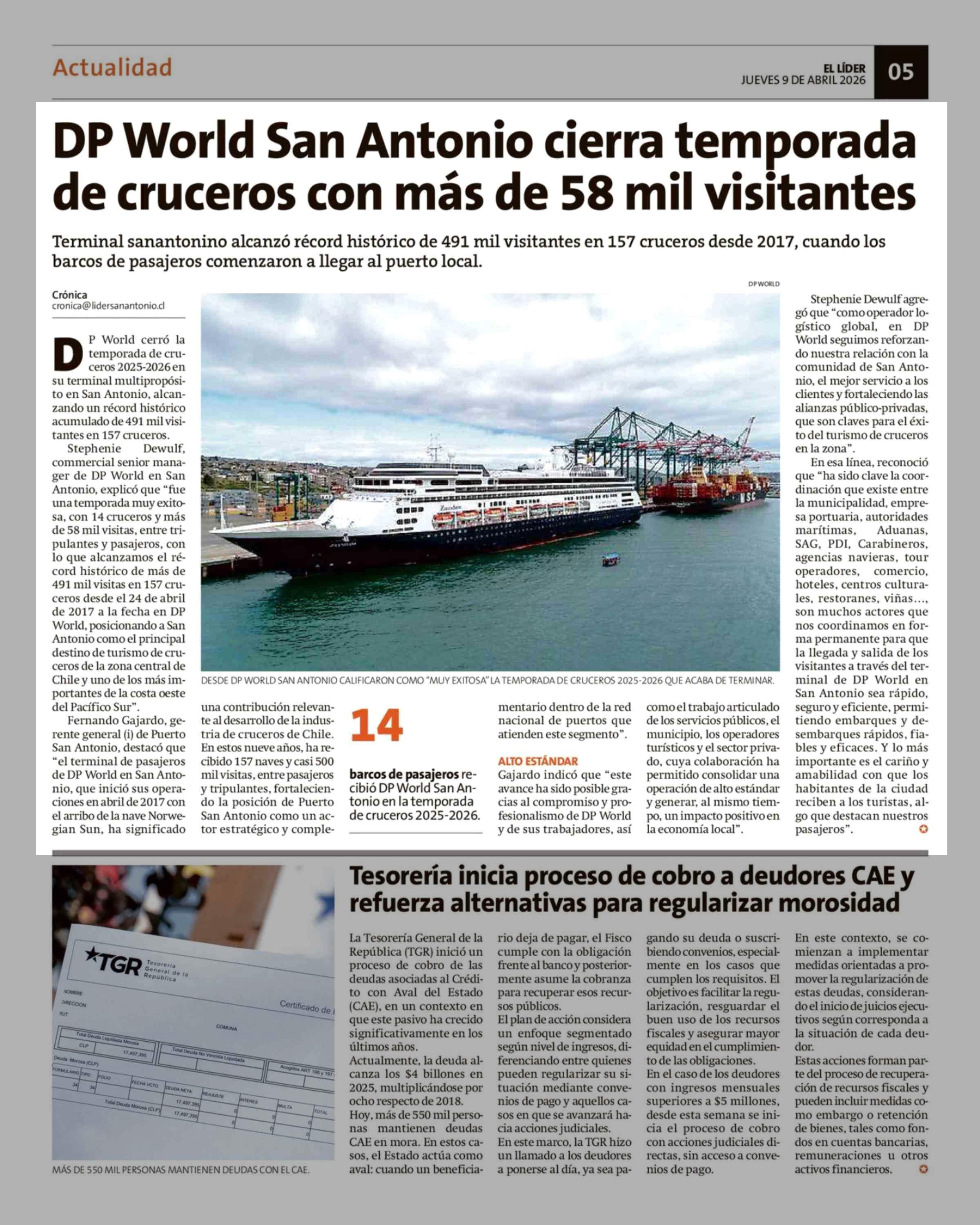 DP World San Antonio cierra temporada de cruceros con más de 58 mil visitantes 09-04-2026 El Líder |