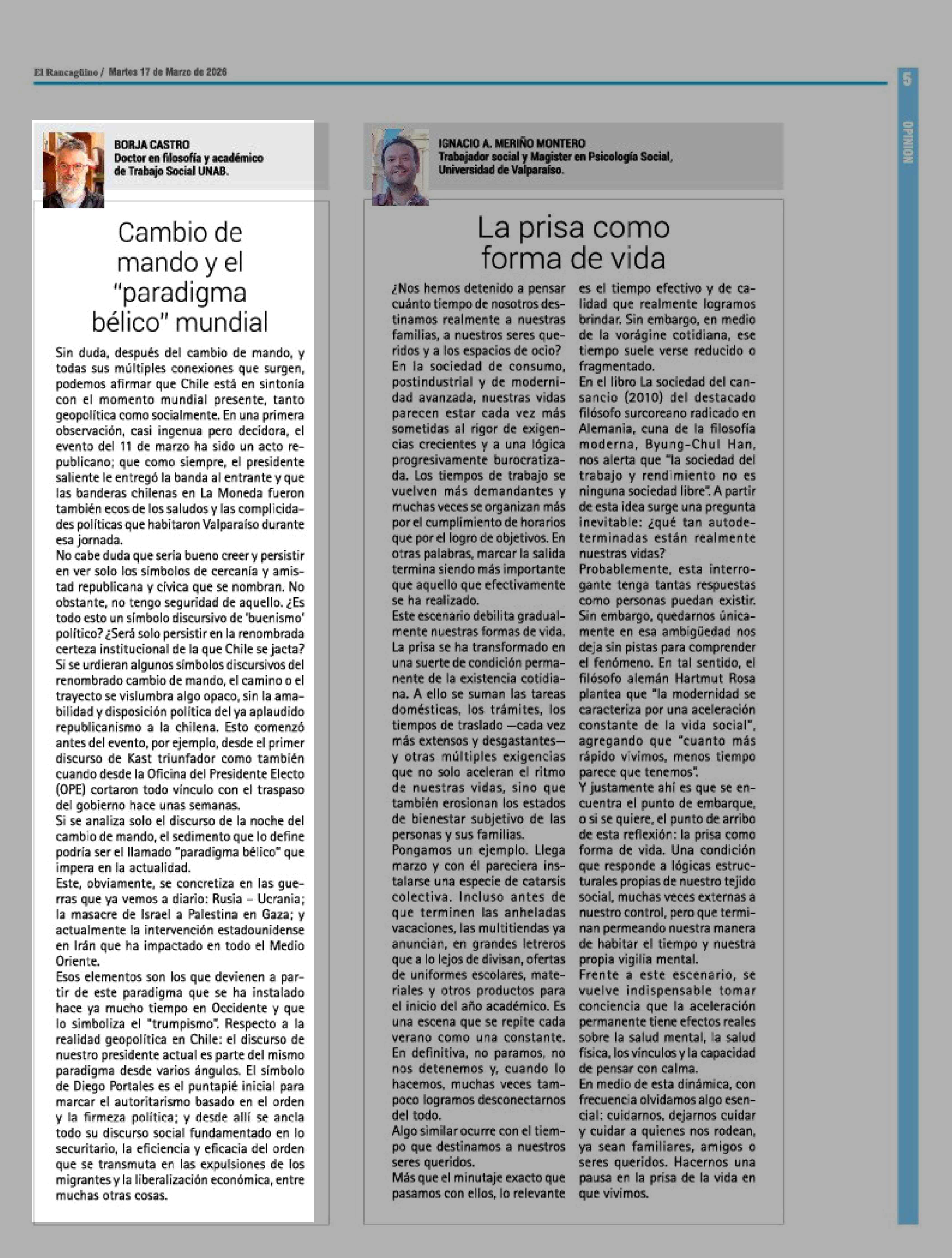 Columnas de Opinión: Cambio de mando y el "paradigma bélico" mundial 17-03-2026 El Rancagüino |