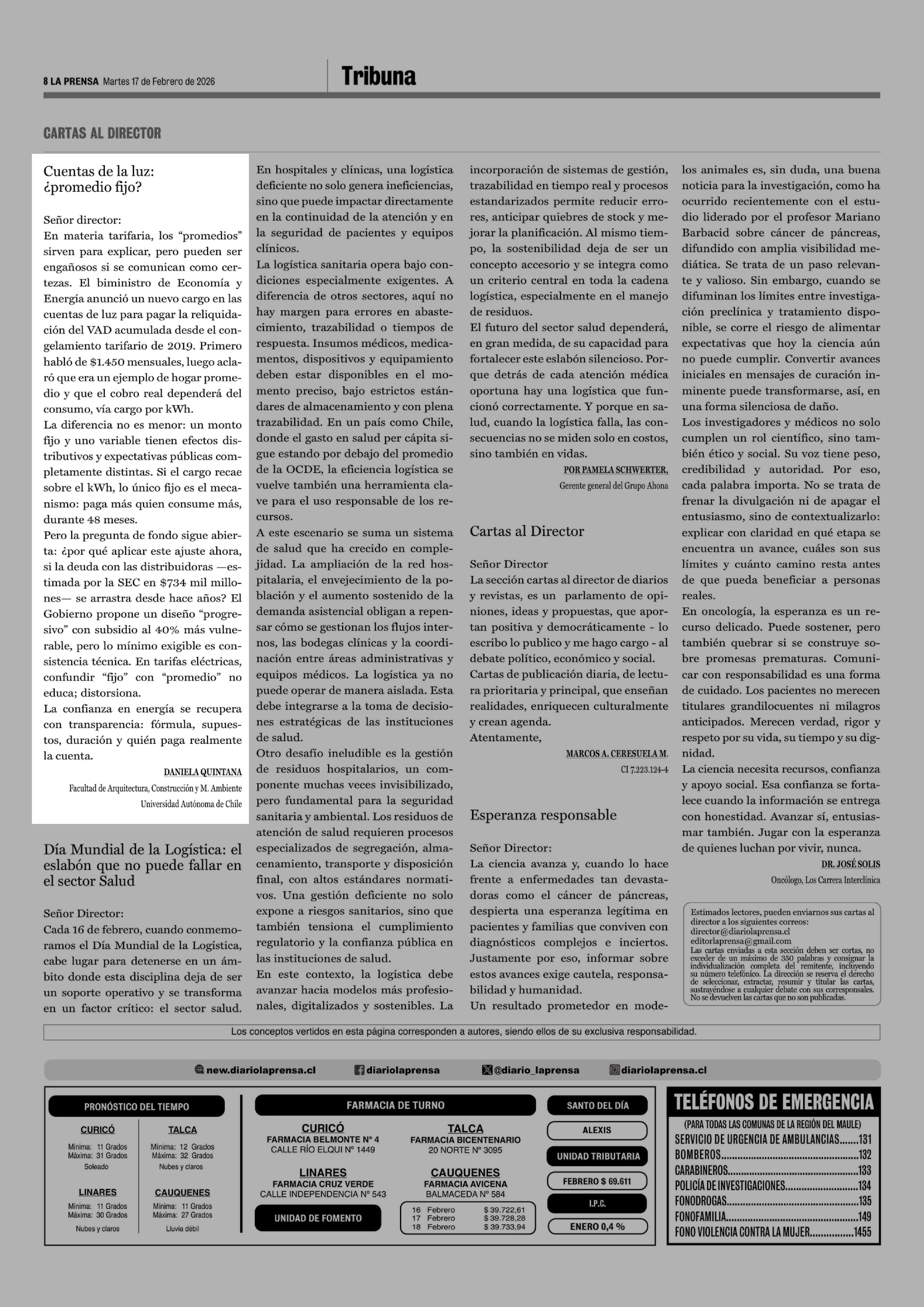 Cartas: Cuentas de la luz: ¿promedio fijo? 17-02-2026 La Prensa de Curicó |