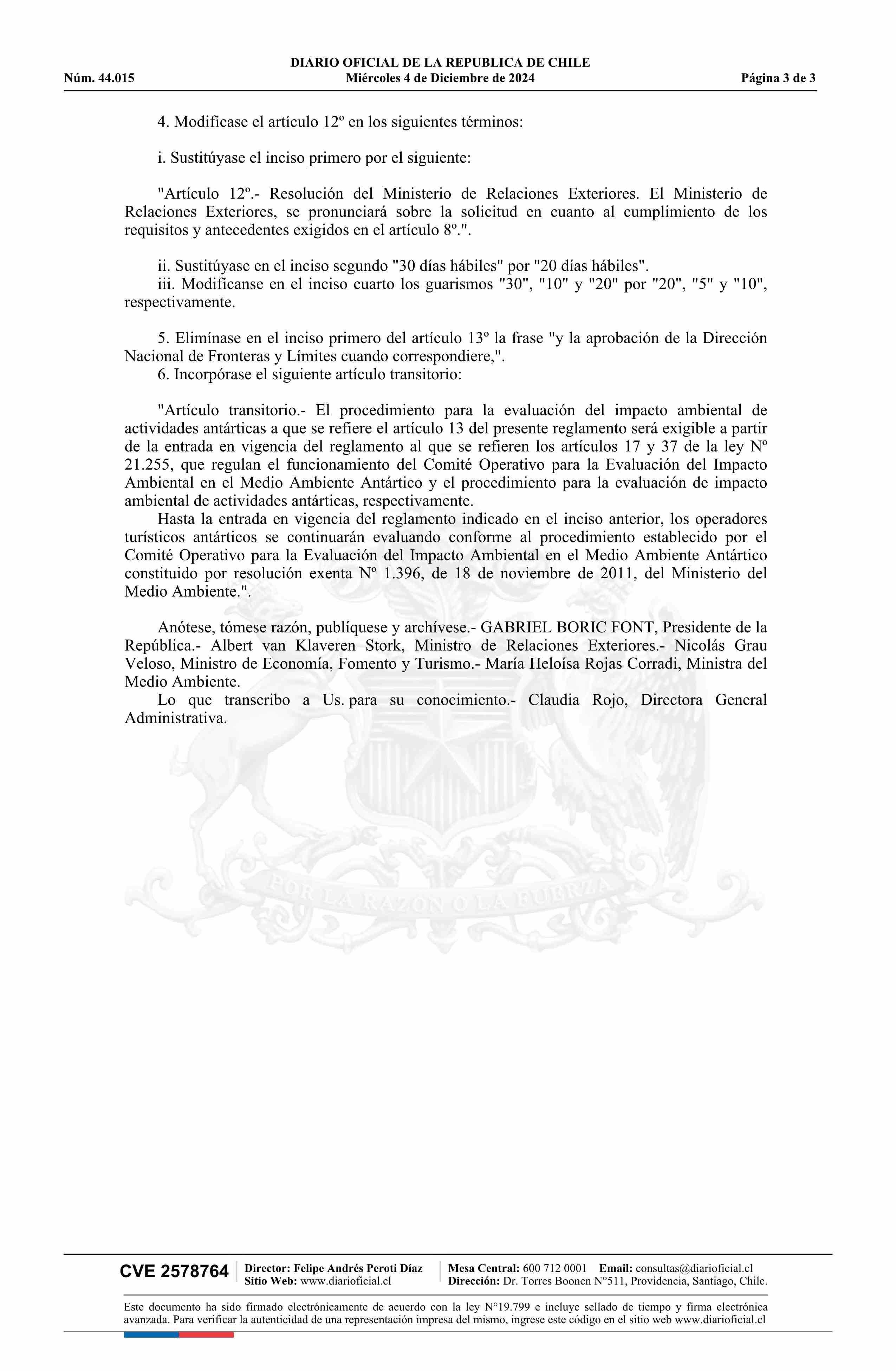 Decreto número 106, de 2024.- Modifica el decreto Nº 63, de 2023, que aprueba reglamento del artículo 31 de la Ley Nº 21.255, sobre las condiciones y requisitos para realizar las actividades de turismo en la Antártica 04-12-2024 DIARIO OFICIAL CHILE - BOLETÍN OFICIAL DE MINERÍA |