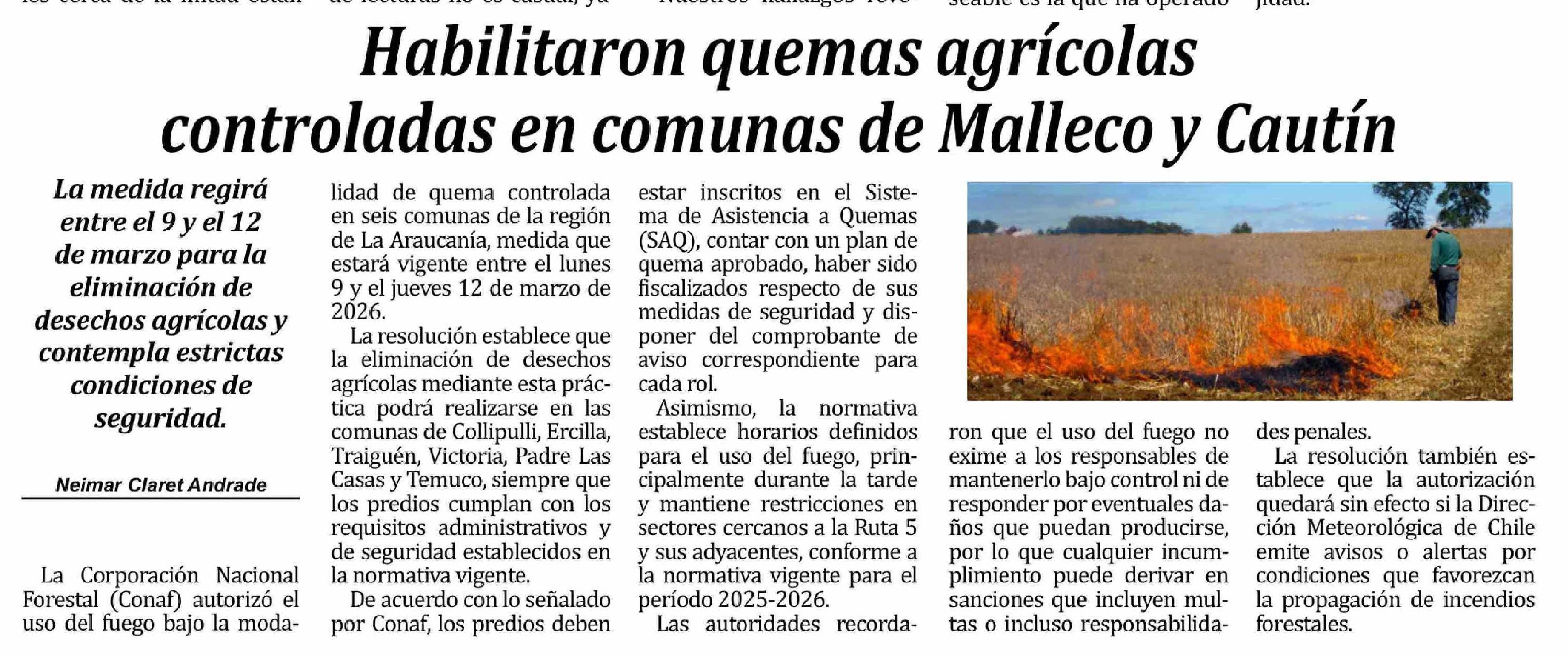 Título: Habilitaron quemas agrícolas controladas en comunas de Malleco y Cautín La medida regirá entre el 9 y el 12 de marzo para la eliminación de desechos agrícolas y contempla estrictas condiciones de seguridad. Neimar Claret Andrade