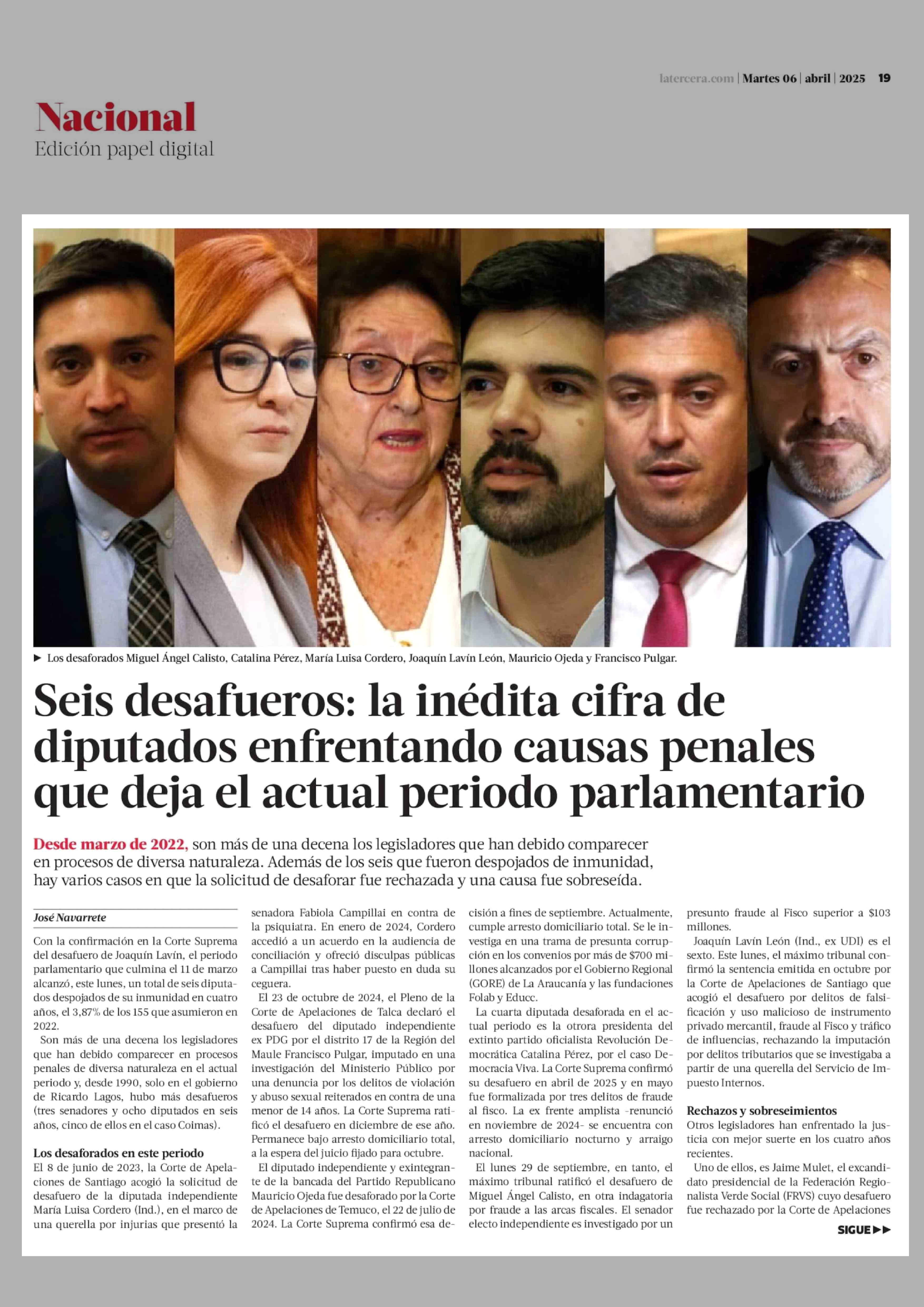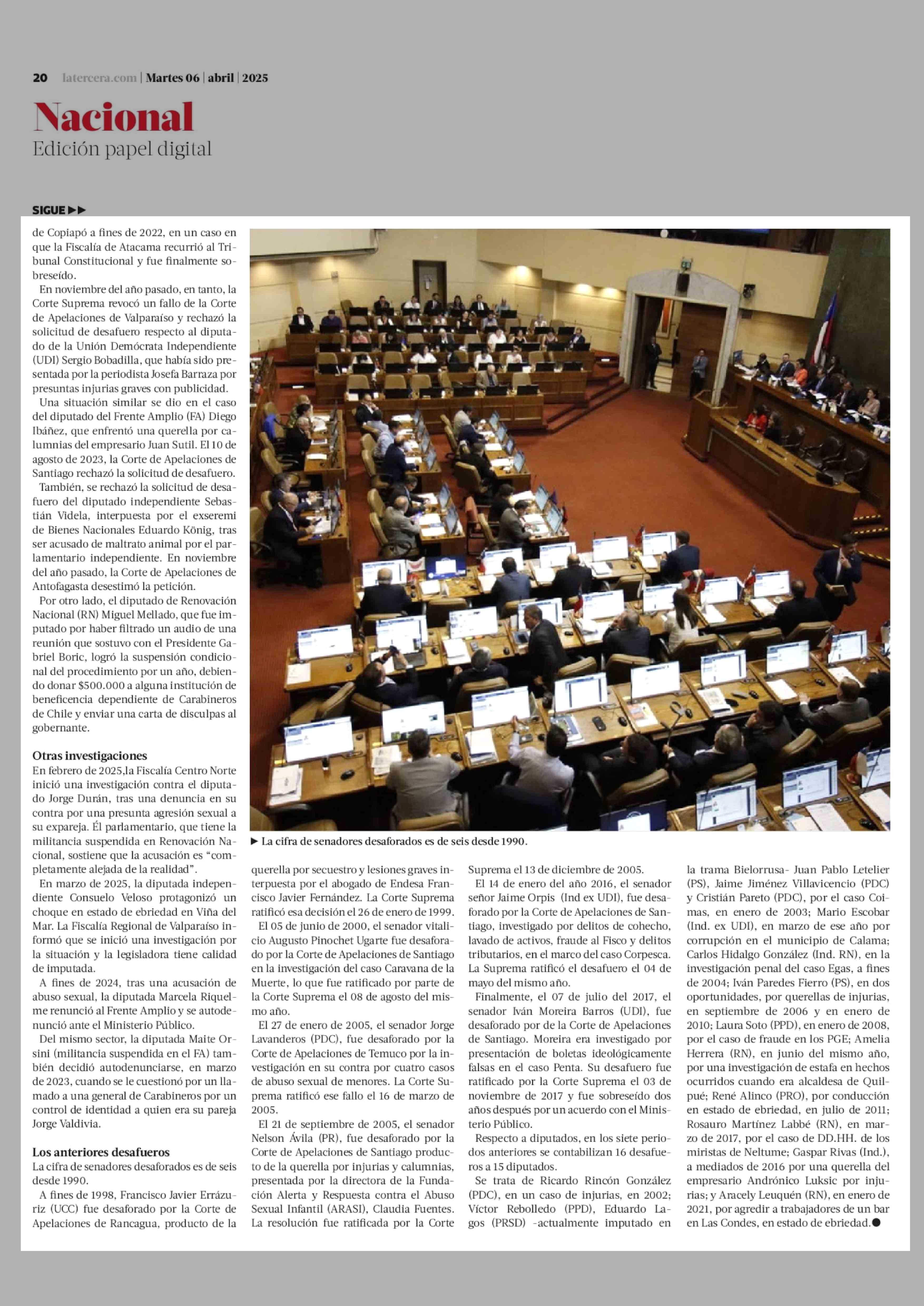 Seis desafueros: la inédita cifra de diputados enfrentando causas penales que deja el actual periodo parlamentario 25-02-2026 La Tercera |