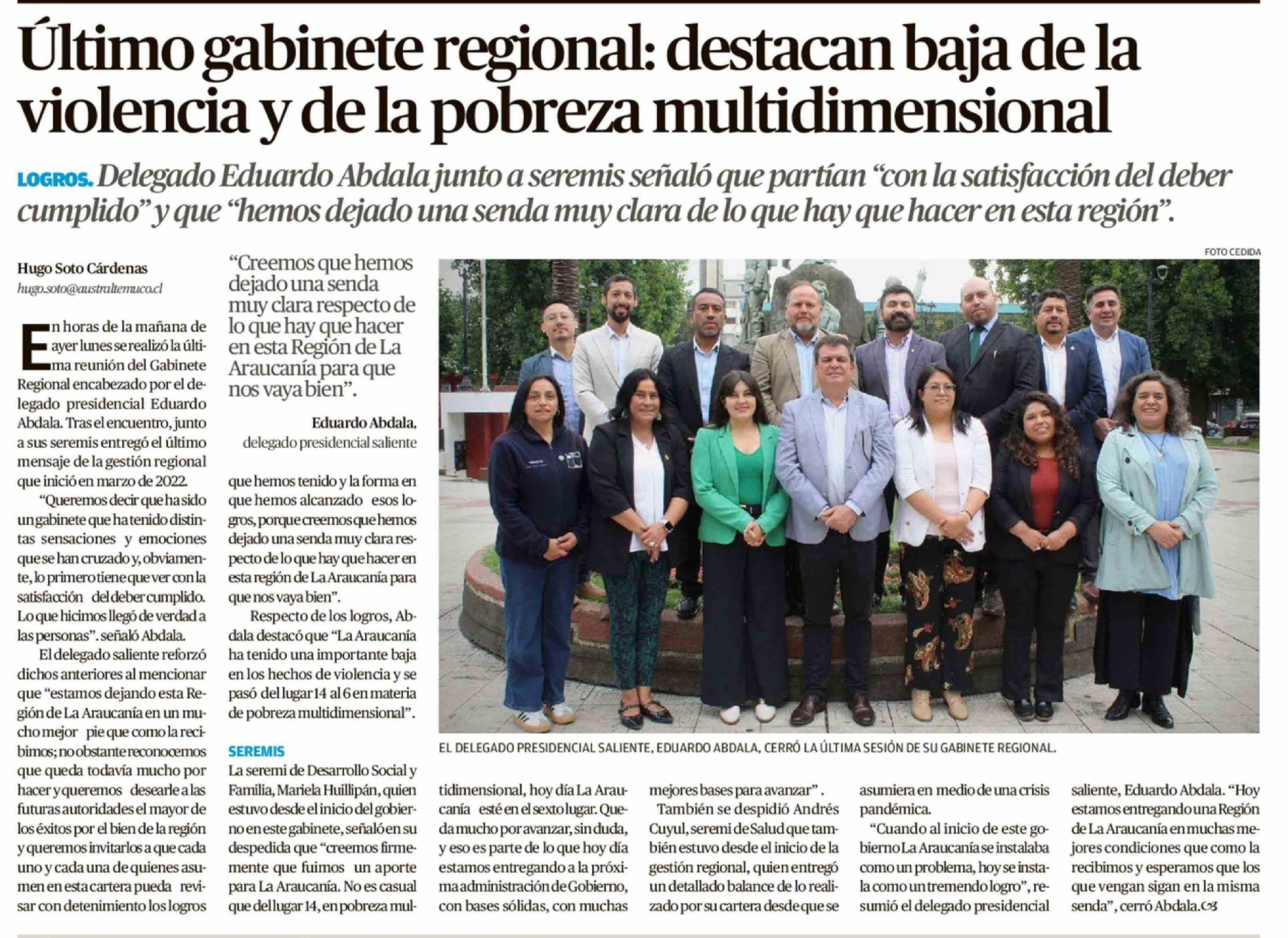 Último gabinete regional: destacan baja de la violencia y de la pobreza multidimensional 11-03-2026 El Austral de la Araucanía |