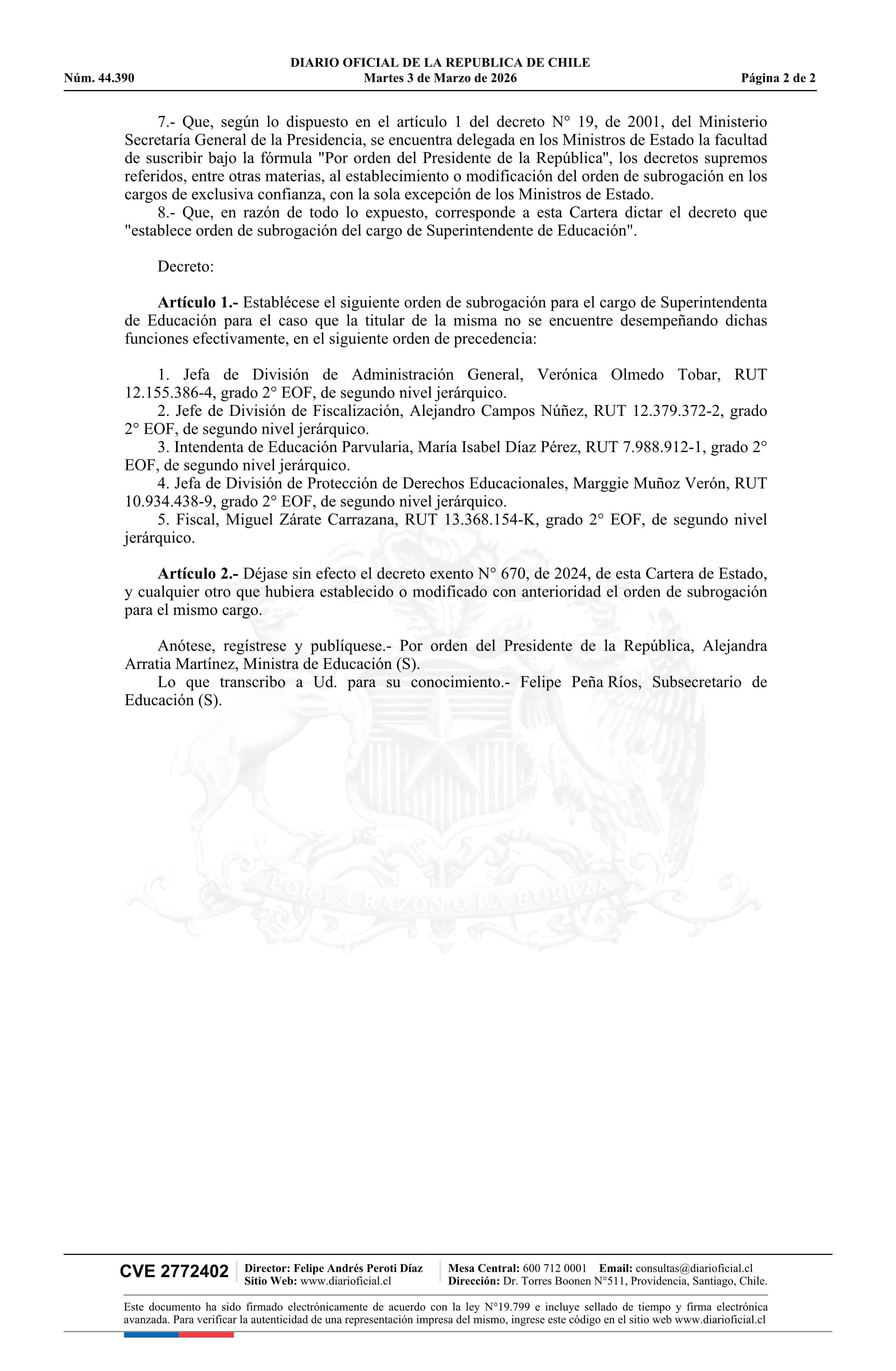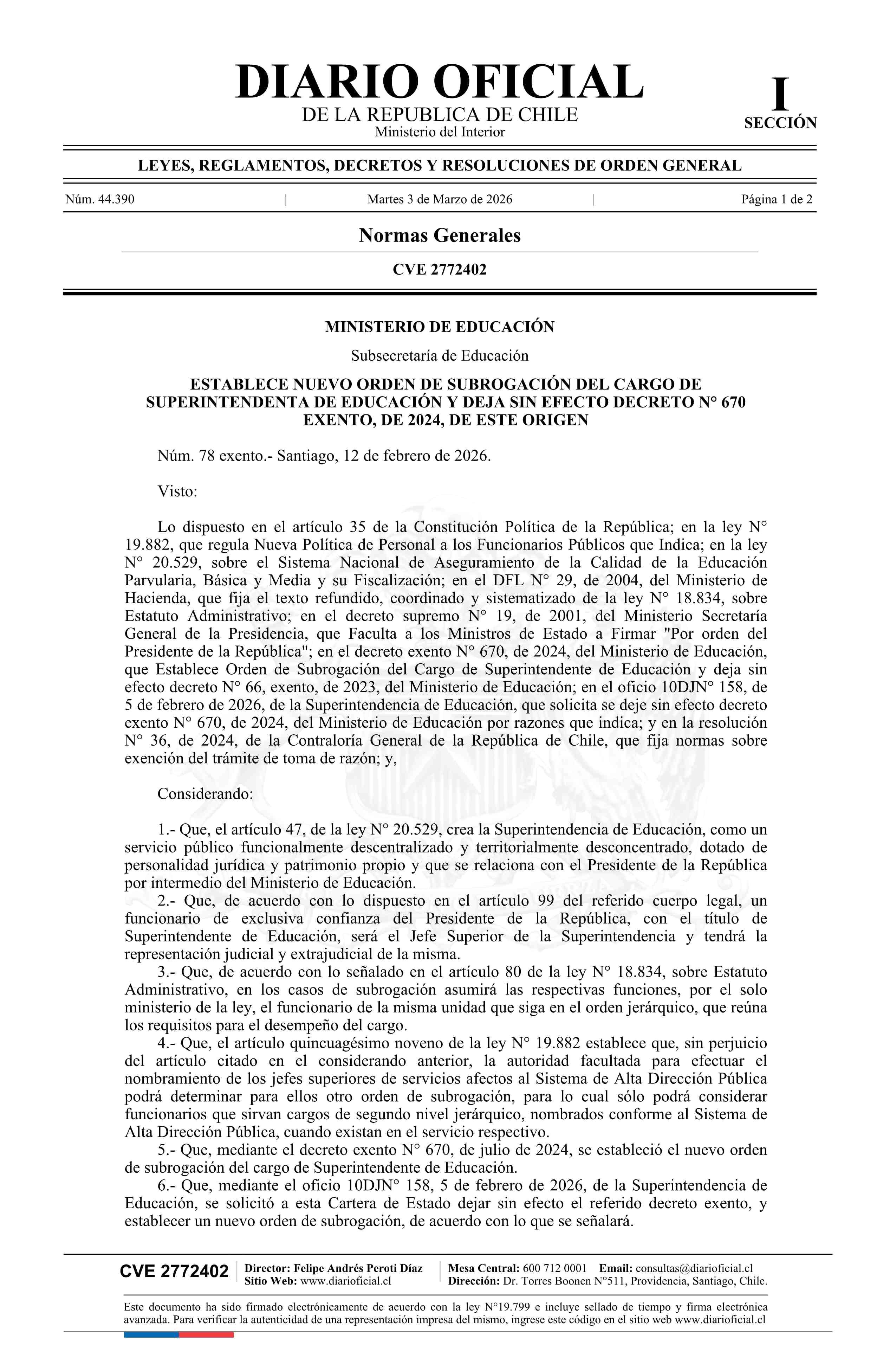 Decreto exento número 78, de 2026.- Establece nuevo orden de subrogación del cargo de Superintendenta de Educación y deja sin efecto decreto N° 670 exento, de 2024 03-03-2026 Diario Oficial Edición Electrónica |
