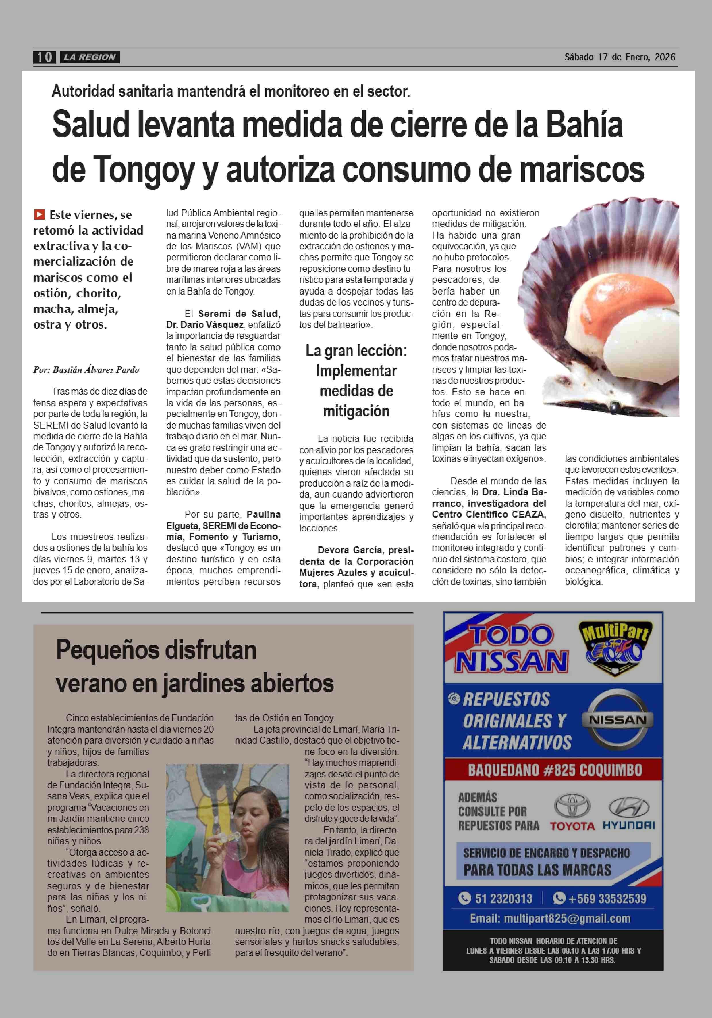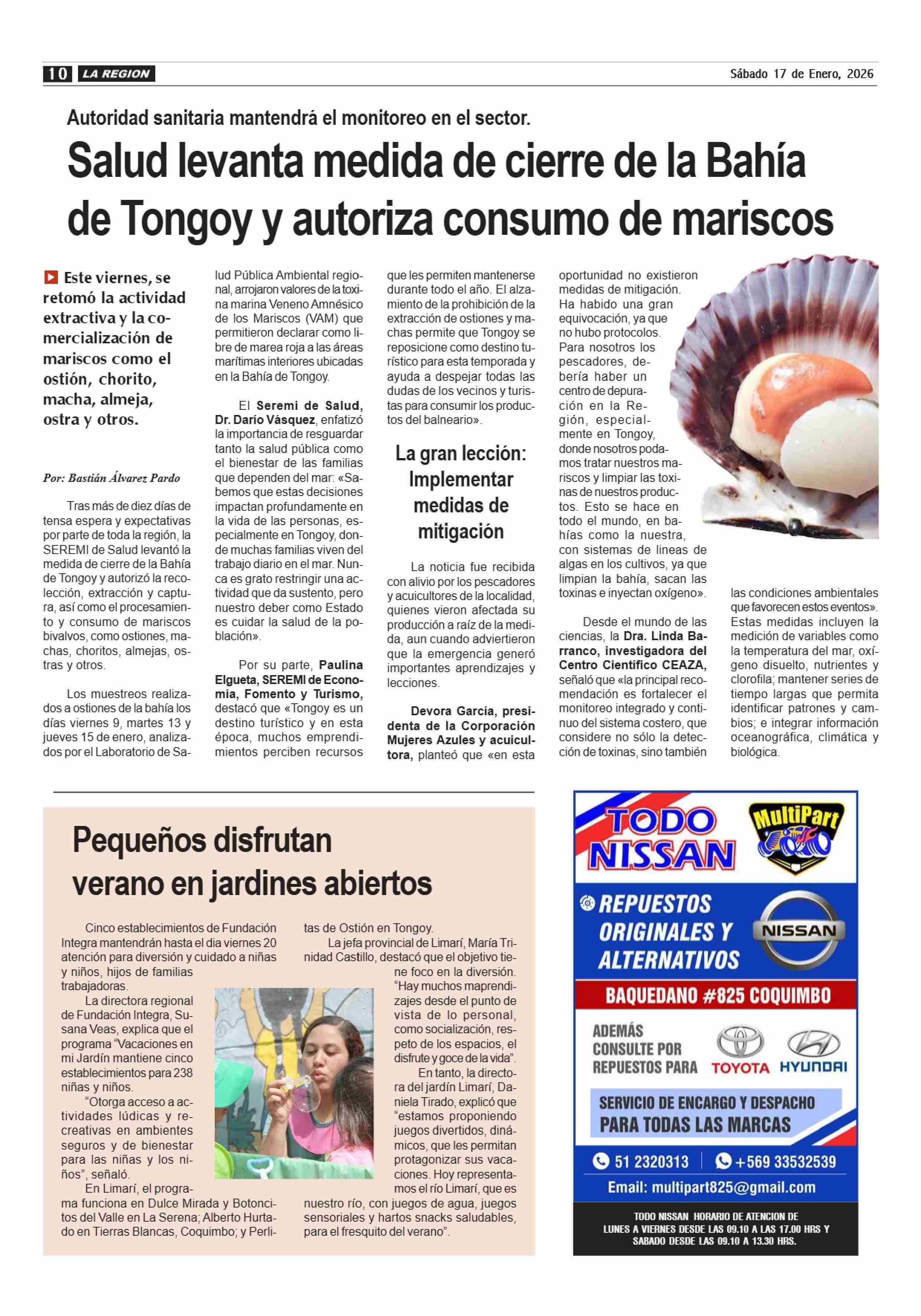 Salud levanta medida de cierre de la Bahía de Tongoy y autoriza consumo de mariscos 17-01-2026 Diario la Región |