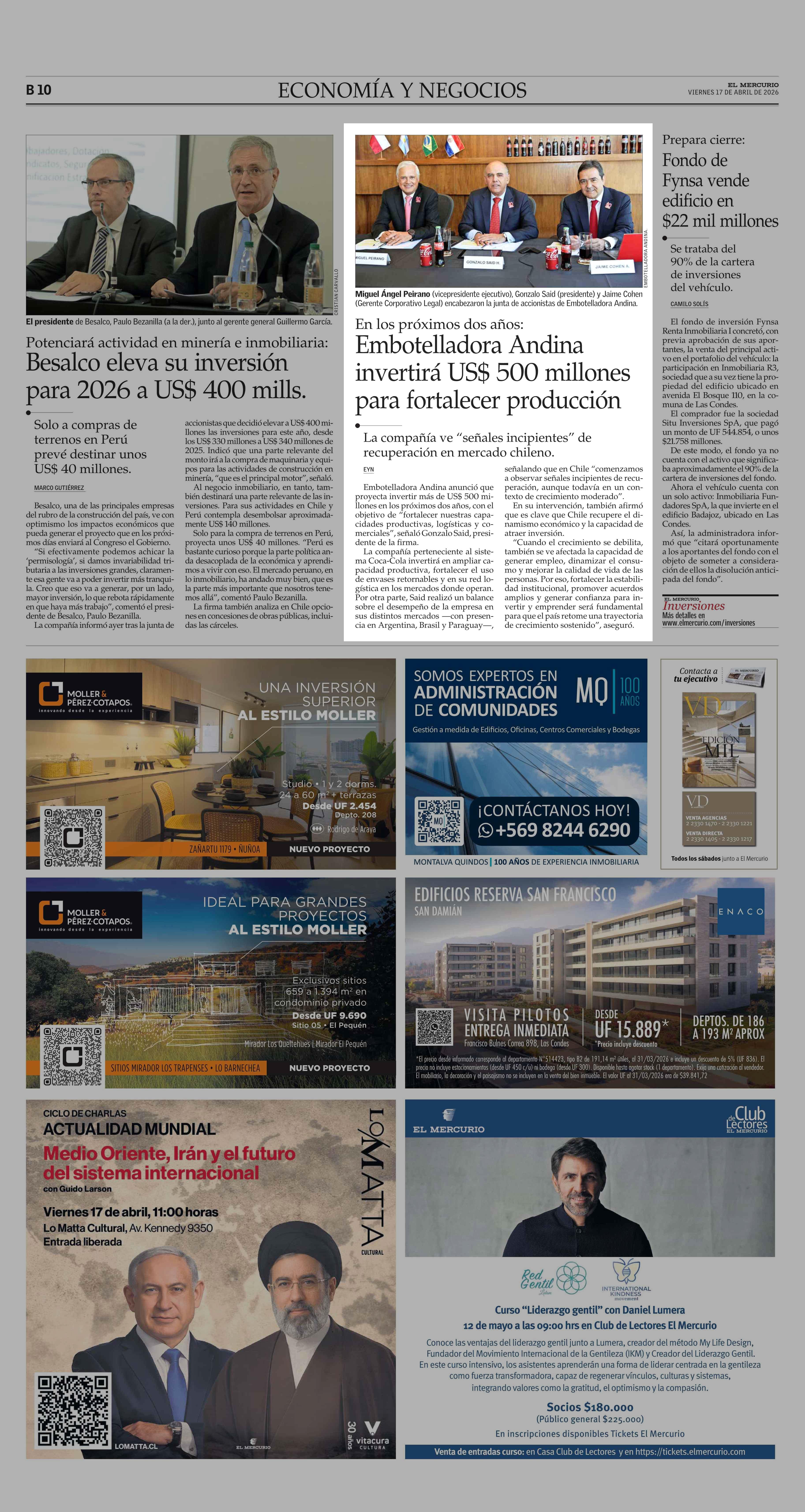 Embotelladora Andina invertirá US$ 500 millones para fortalecer producción 17-04-2026 El Mercurio |