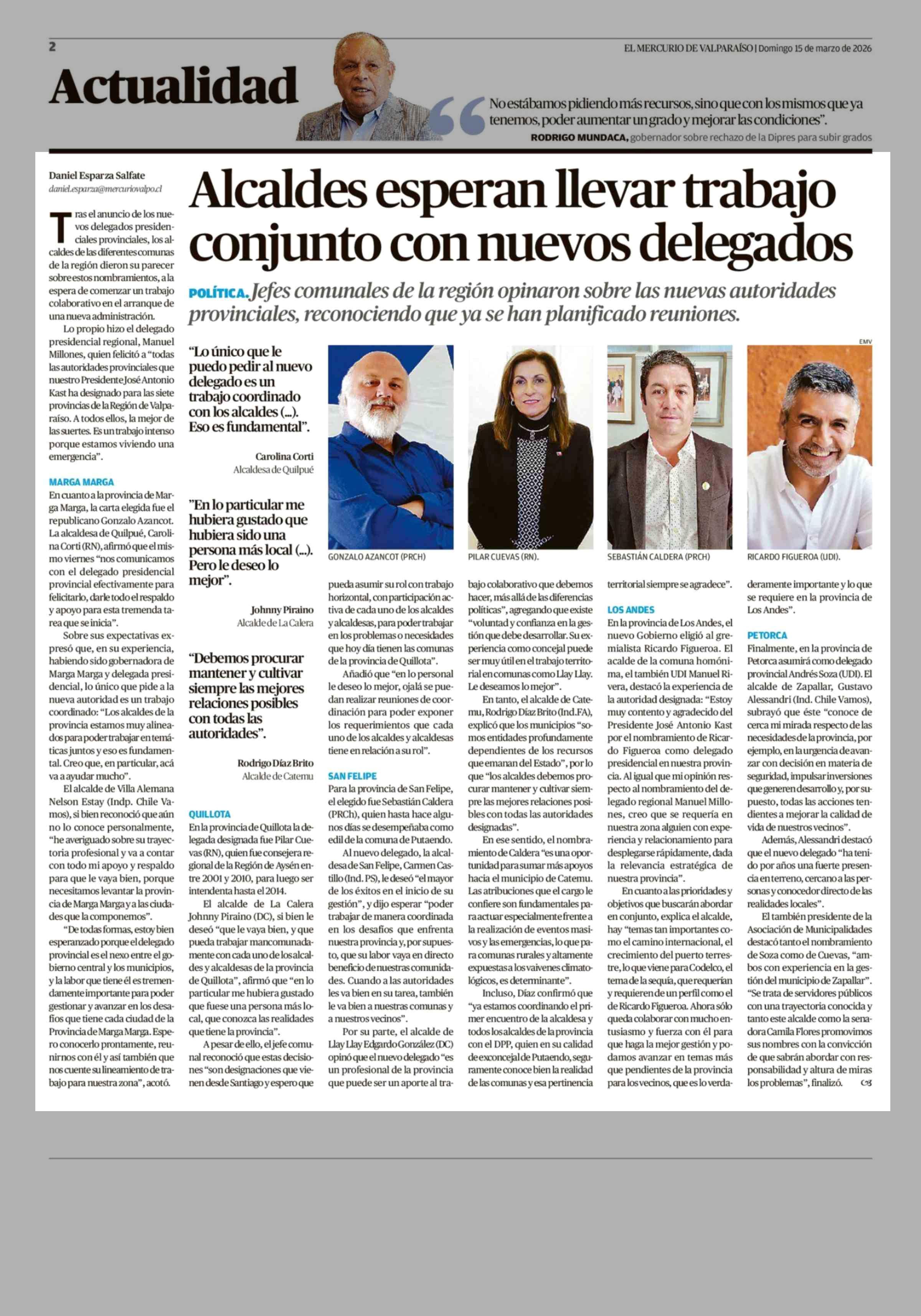 Alcaldes esperan llevar trabajo conjunto con nuevos delegados 15-03-2026 El Mercurio de Valparaíso |