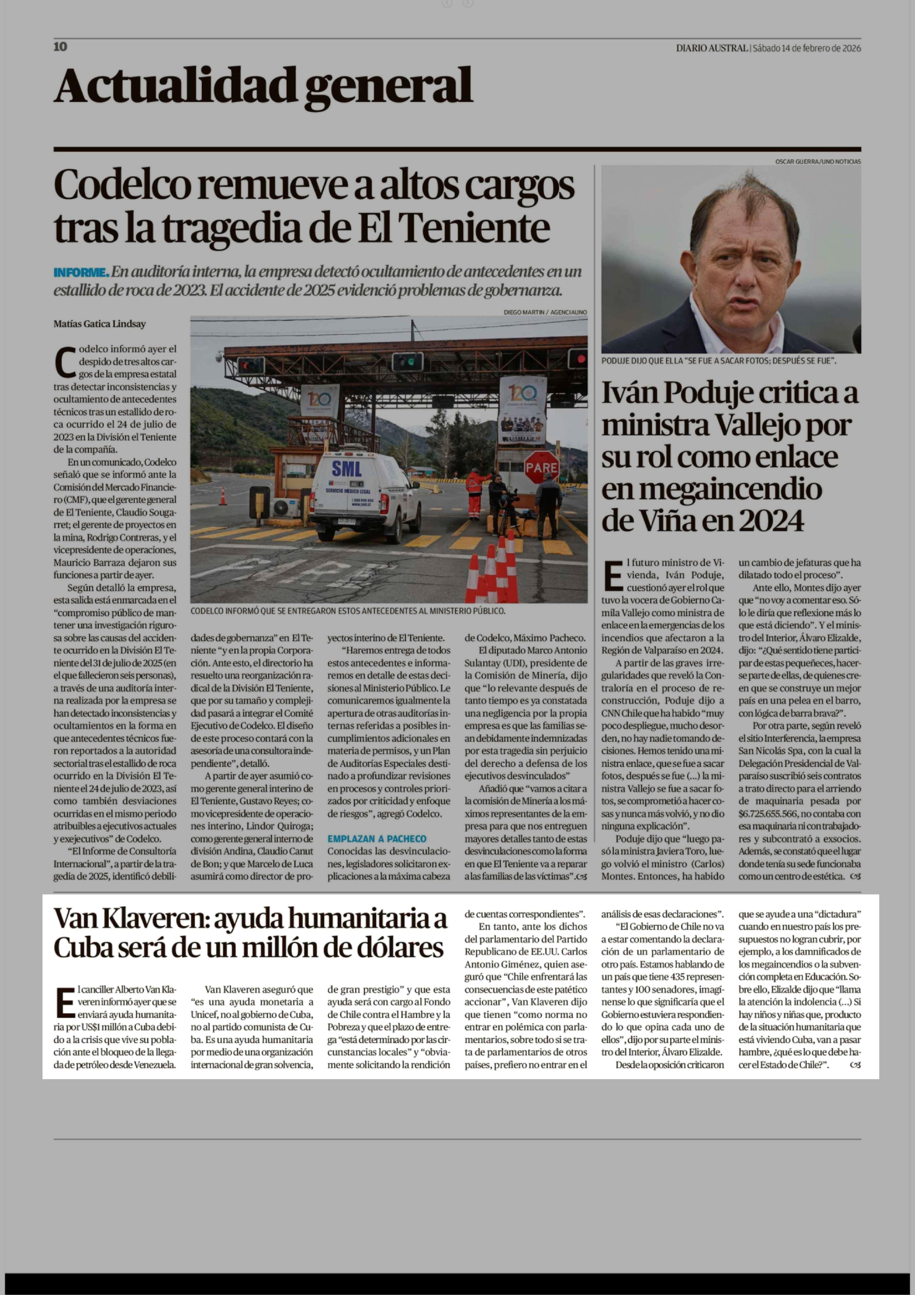 Van Klaveren: ayuda humanitaria a Cuba será de un millón de dólares 14-02-2026 Diario Austral Región de Los Ríos |