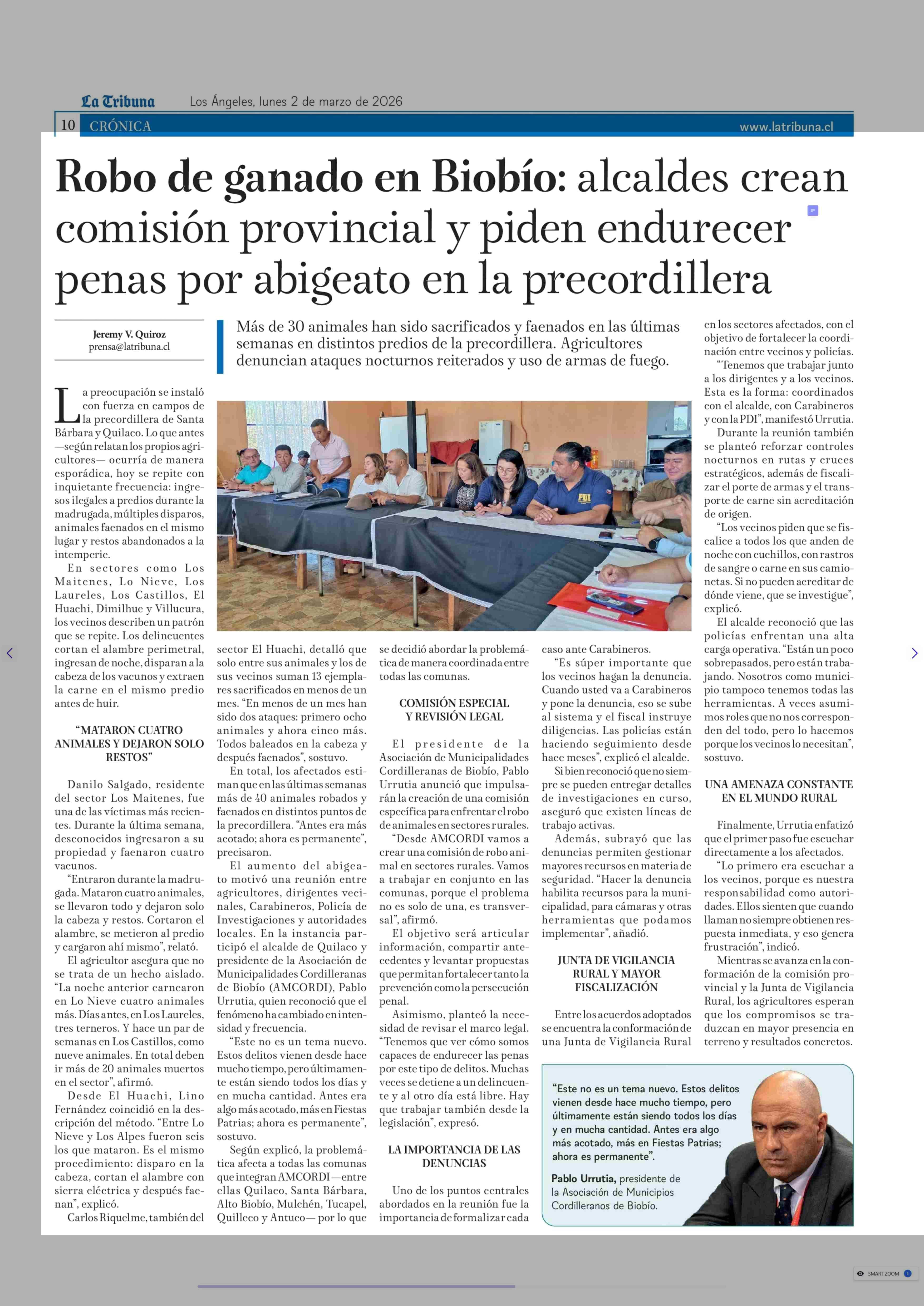 Robo de ganado en Biobío: alcaldes crean comisión provincial y piden endurecer penas por abigeato en la precordillera 02-03-2026 La Tribuna |
