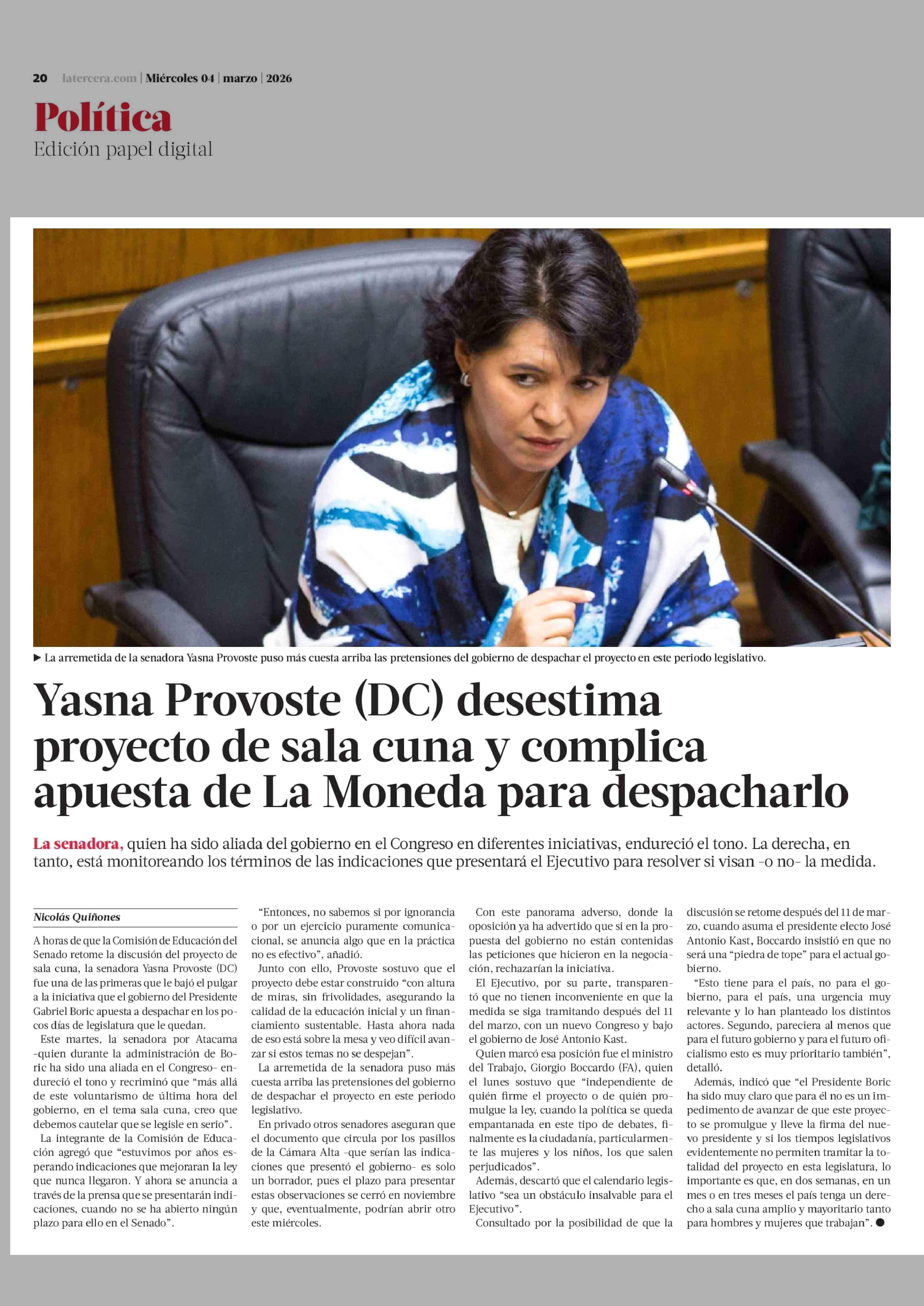 Yasna Provoste (DC) desestima proyecto de sala cuna y complica apuesta de La Moneda para despacharlo 04-03-2026 La Tercera |