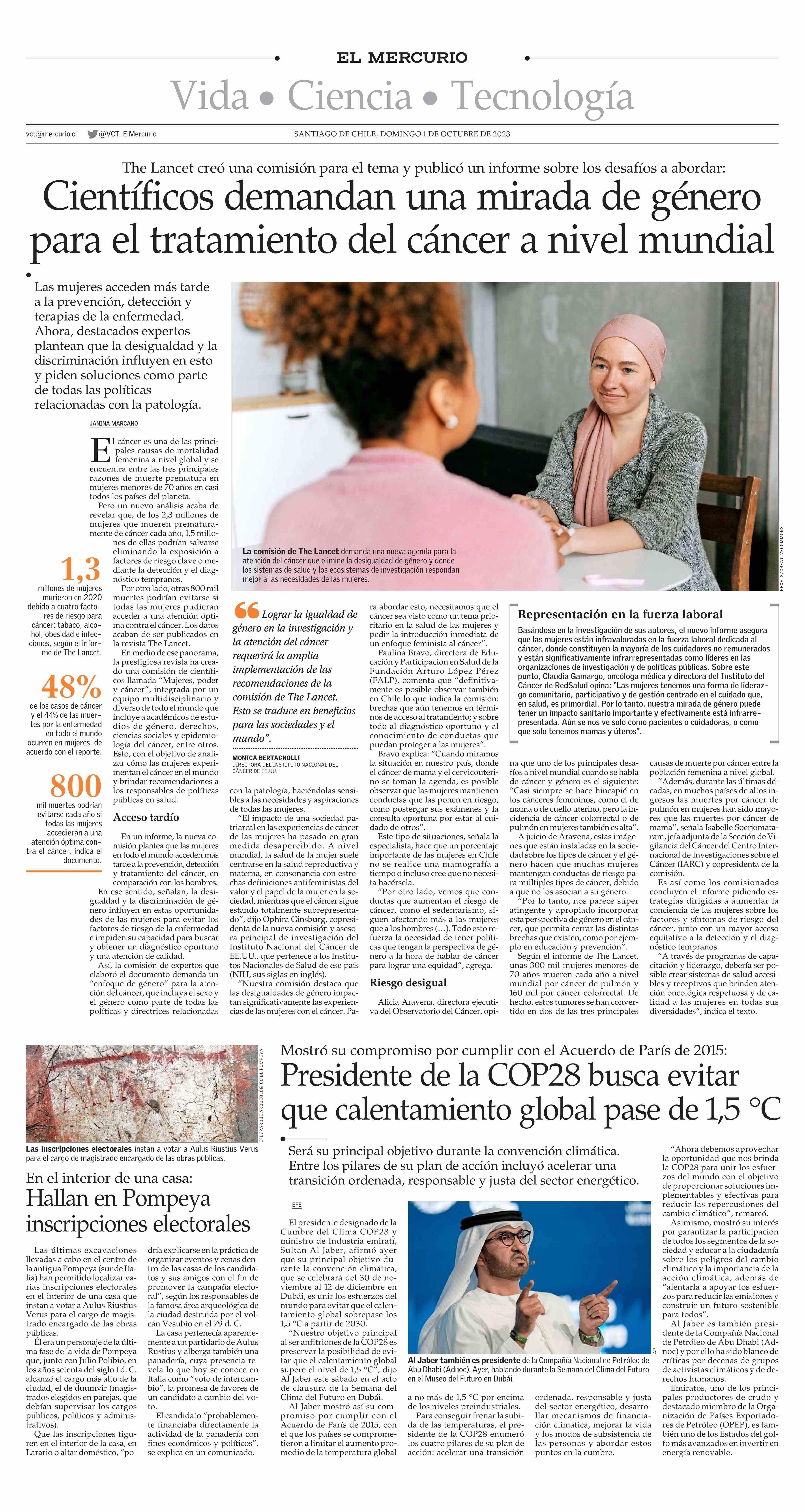 Científicos demandan una mirada de género para el tratamiento del cáncer a nivel mundial 01-10-2023 El Mercurio |