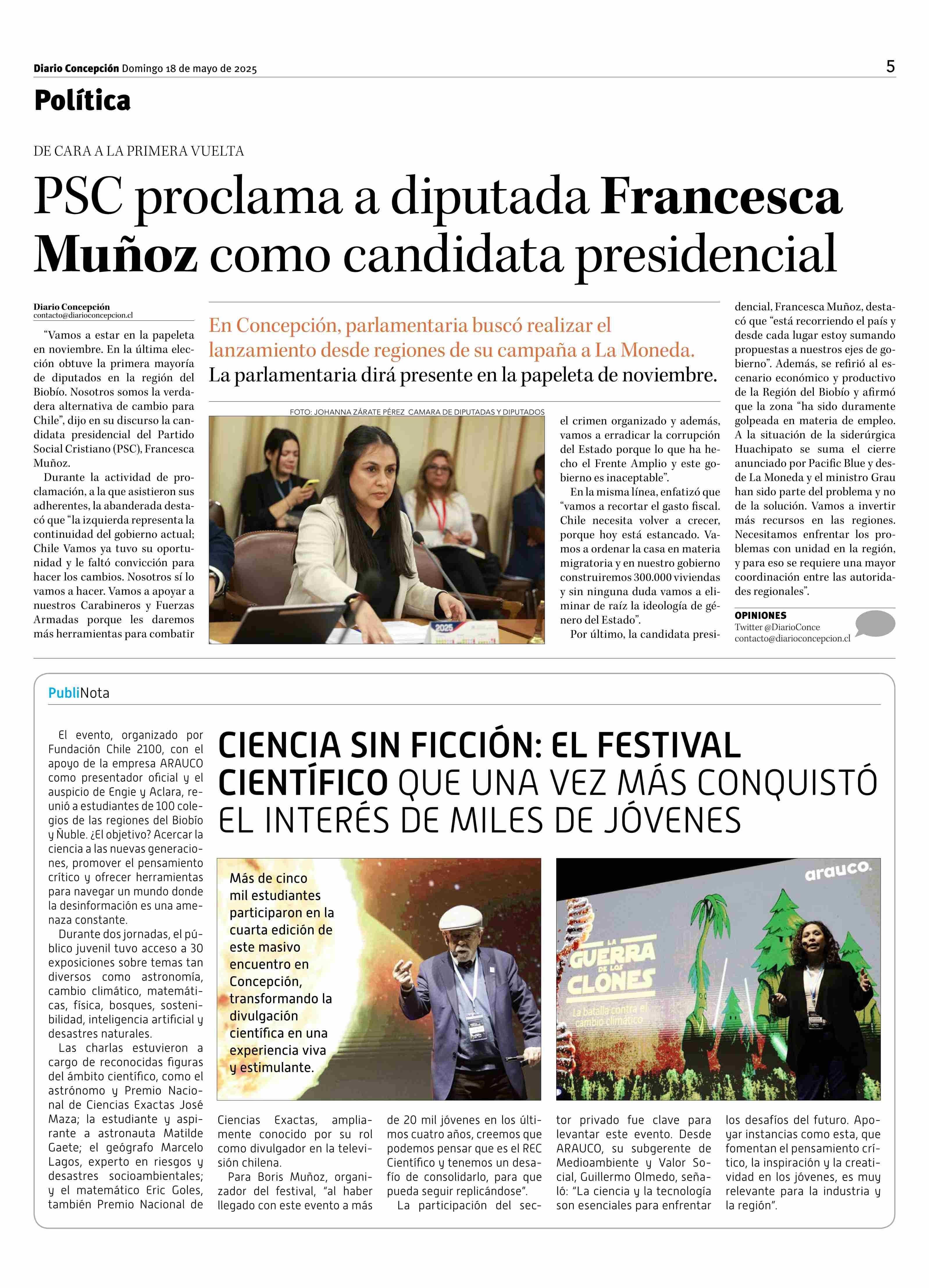 PSC proclama a diputada Francesca Muñoz como candidata presidencial 18-05-2025 Diario Concepción |