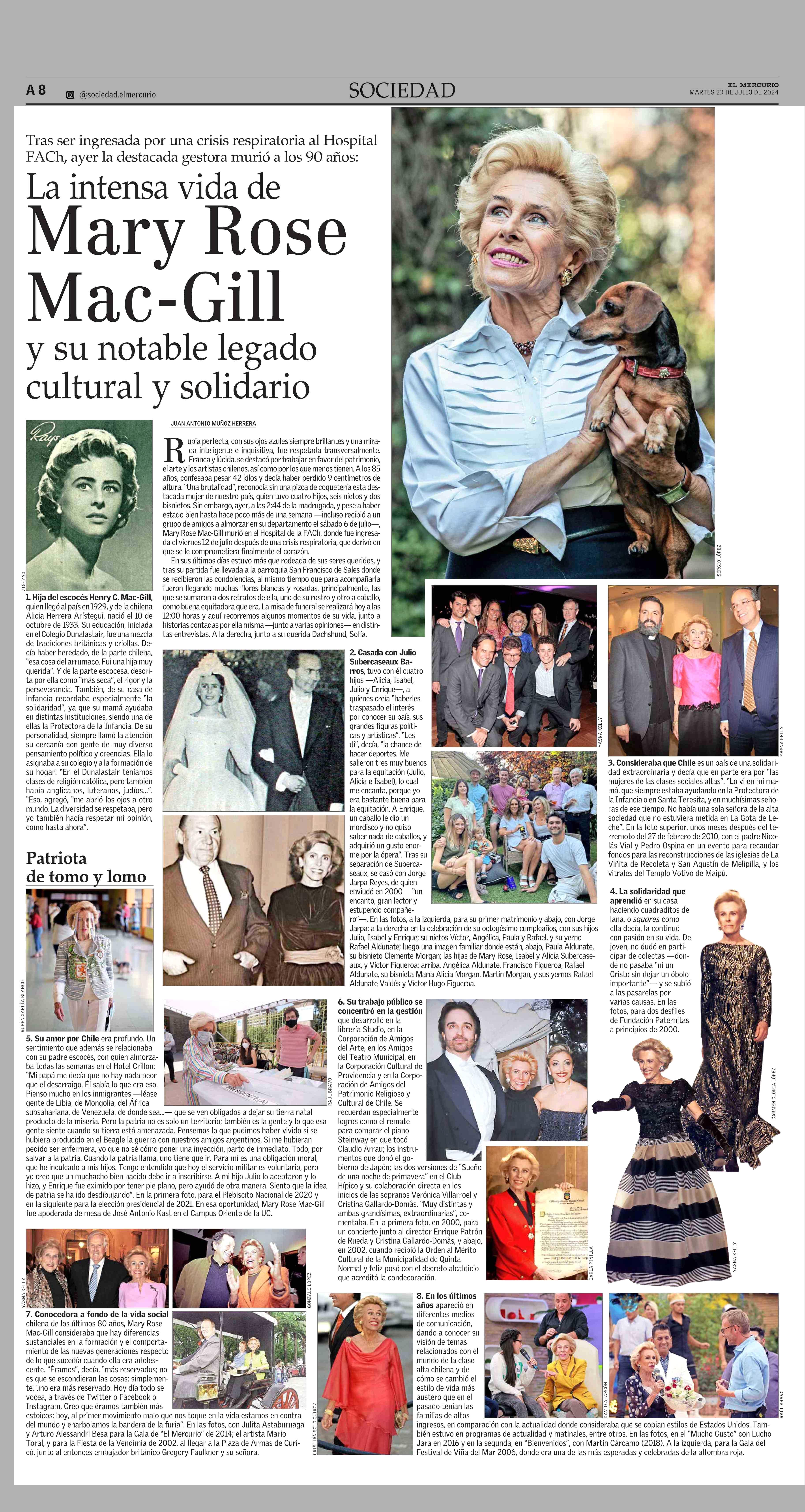 La intensa vida de Mary Rose Mac-Gill y su notable legado cultural y solidario 23-07-2024 El Mercurio |