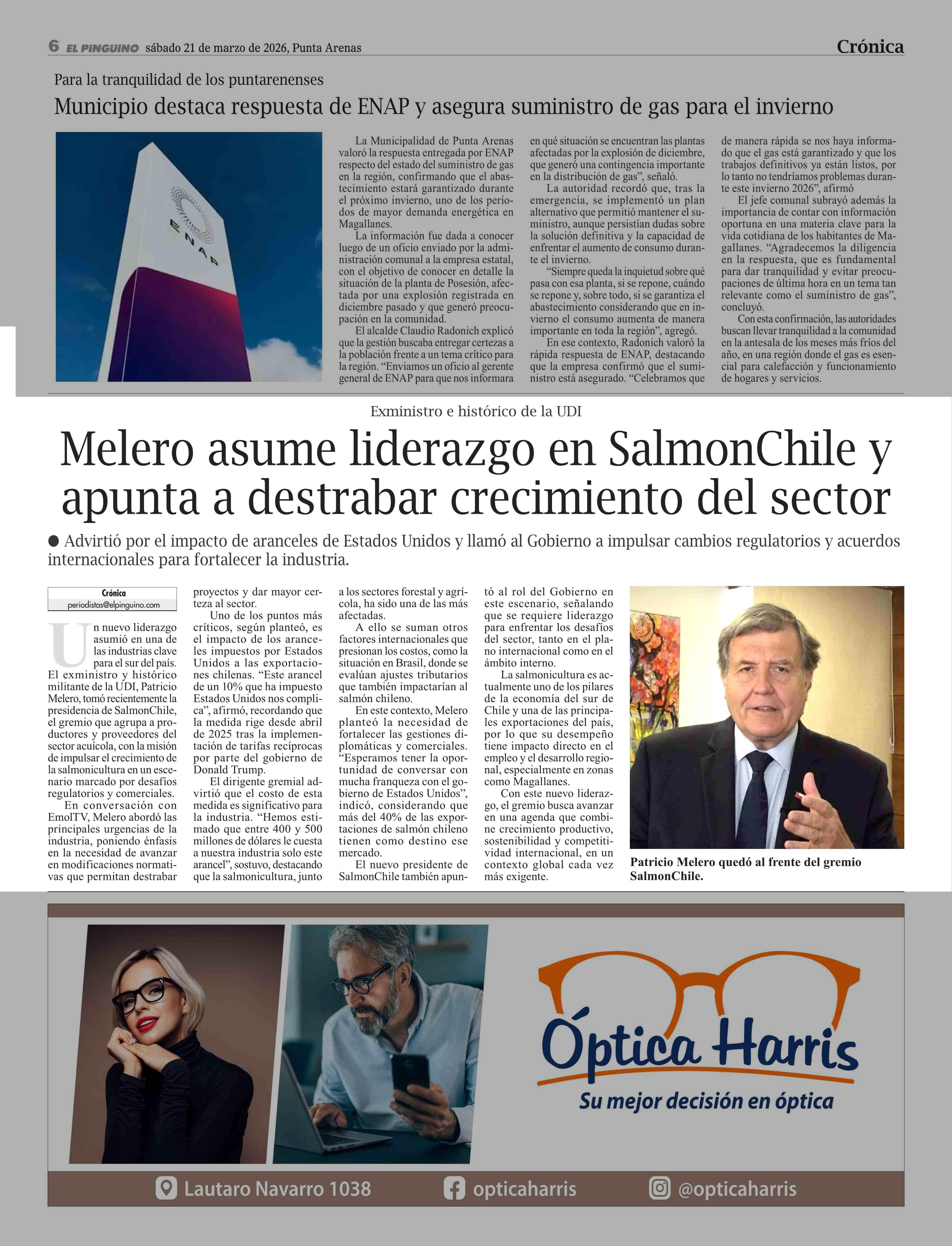 Melero asume liderazgo en SalmonChile y apunta a destrabar crecimiento del sector 21-03-2026 El Pingüino |