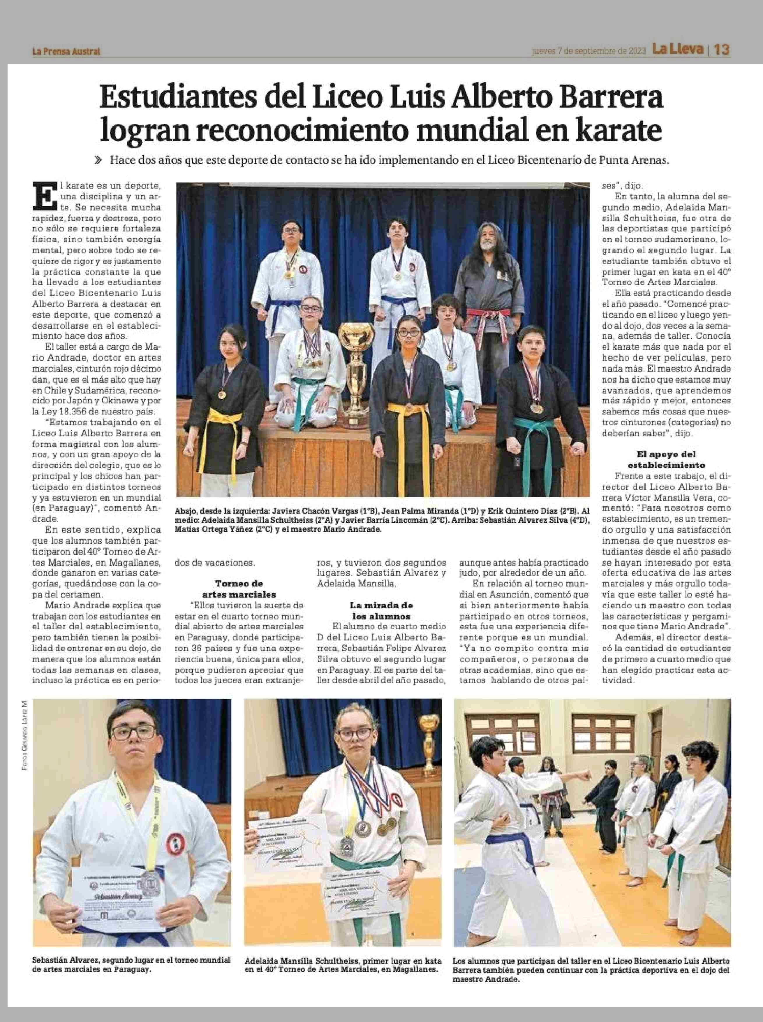 Estudiantes del Liceo Luis Alberto Barrera logran reconocimiento mundial en karate 07-09-2023 La Prensa Austral |