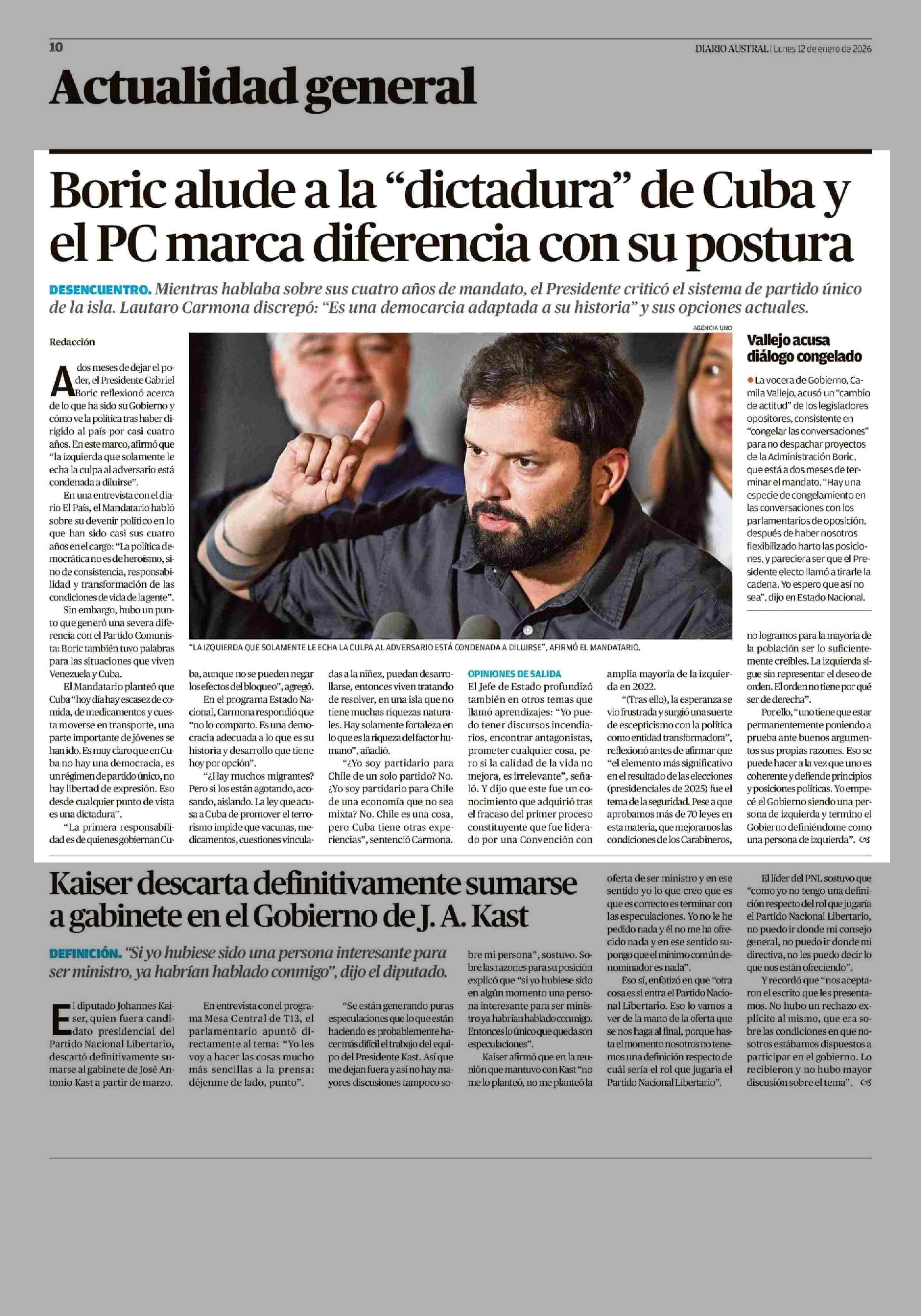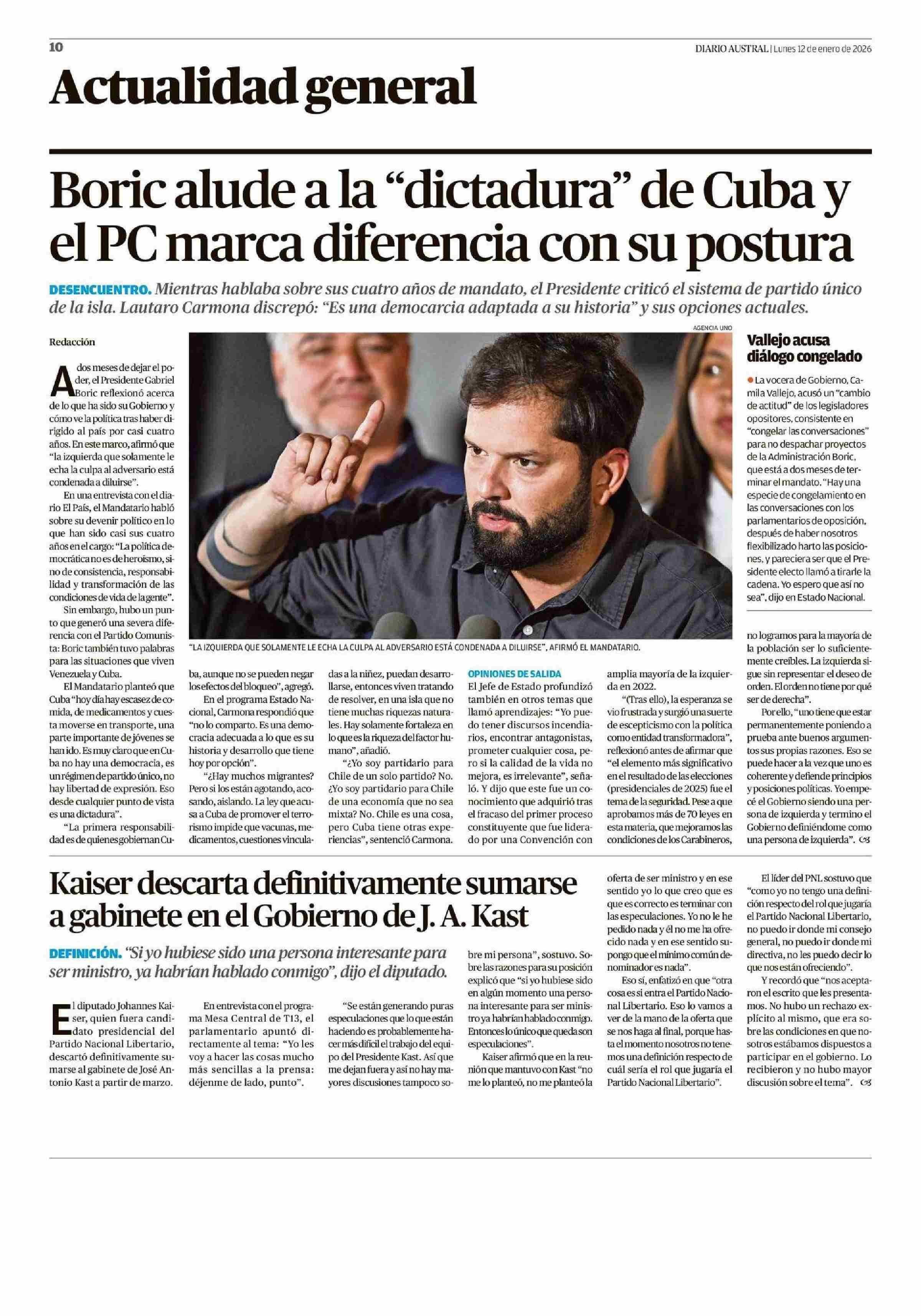 Boric alude a la "dictadura" de Cuba y el PC marca diferencia con su postura 12-01-2026 Diario Austral Región de Los Ríos |