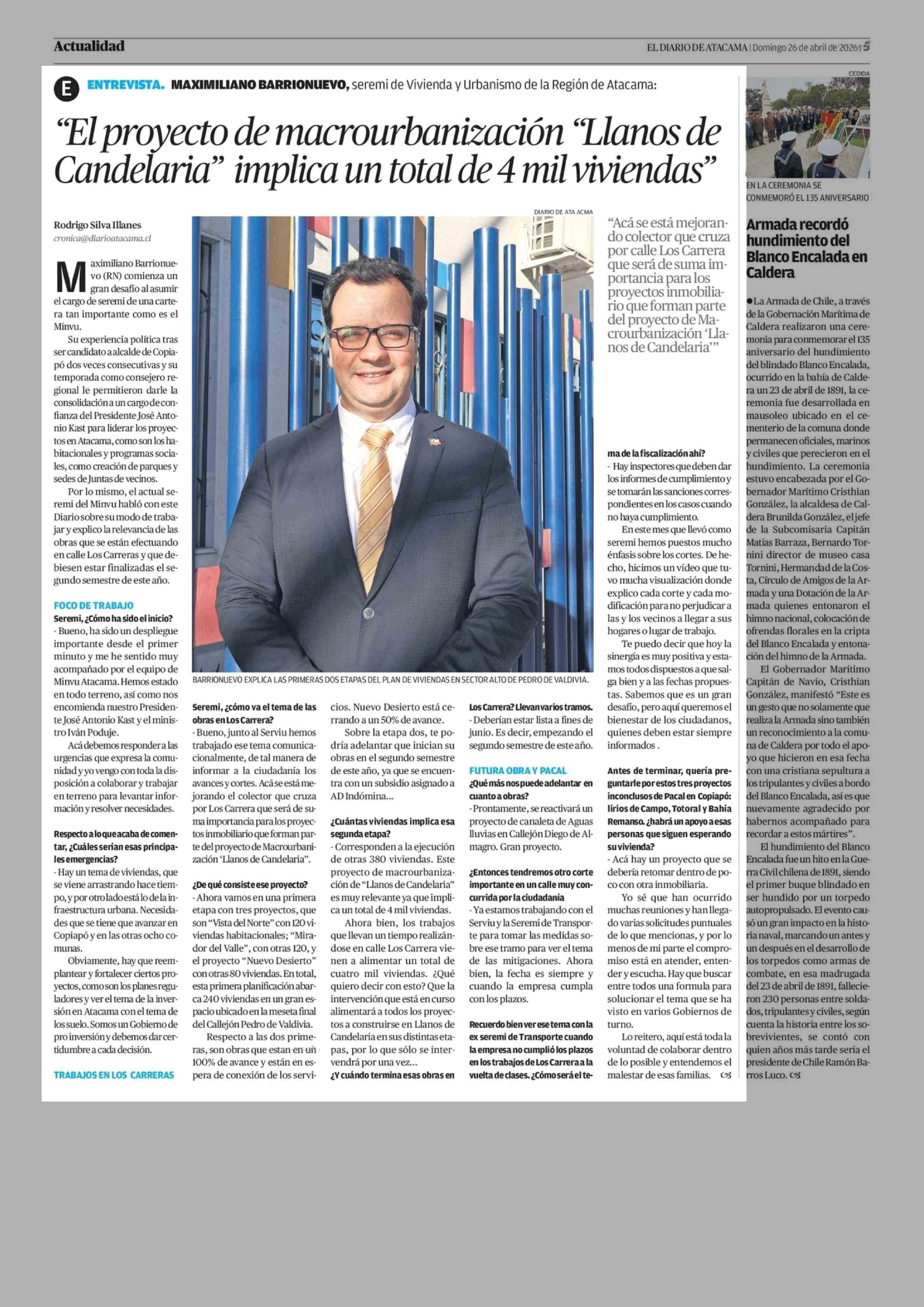 "El proyecto de macrourbanización "Llanos de Candelaria" implica un total de 4 mil viviendas" 26-04-2026 El Diario de Atacama |
