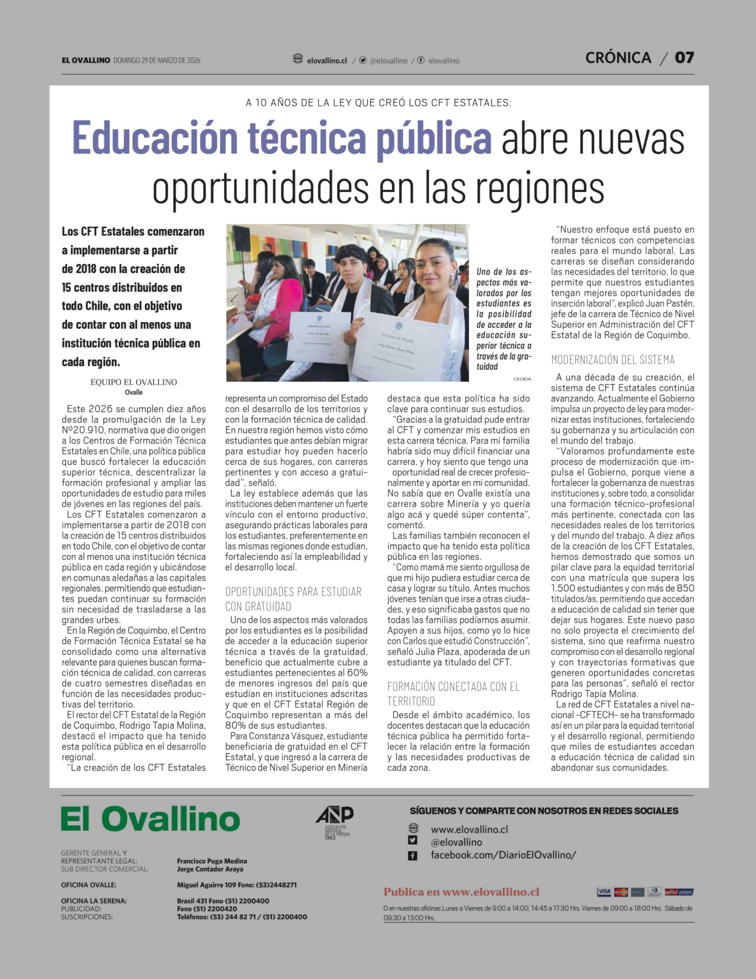 Educación técnica pública abre nuevas oportunidades en las regiones 29-03-2026 El Ovallino |