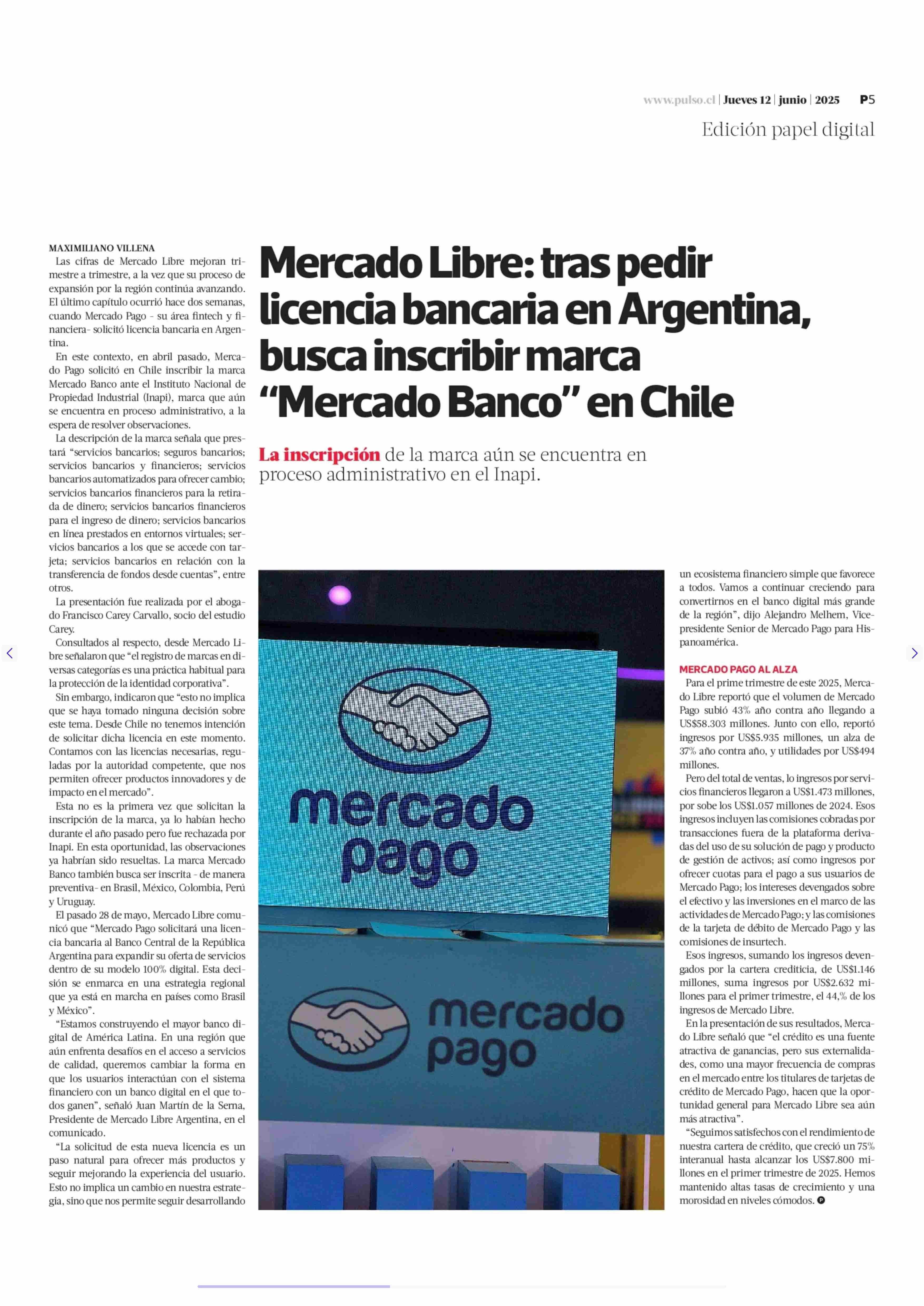 Título: Mercado Libre: tras pedir licencia bancaria en Argentina, busca inscribir marca "Mercado Banco" en Chile