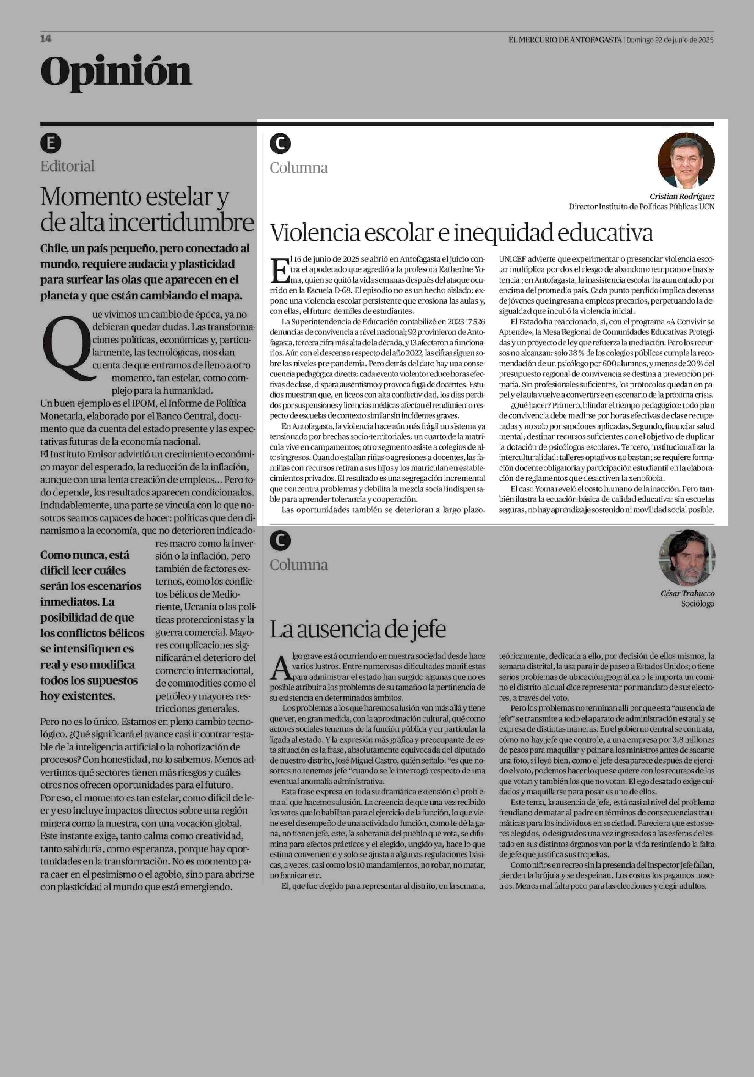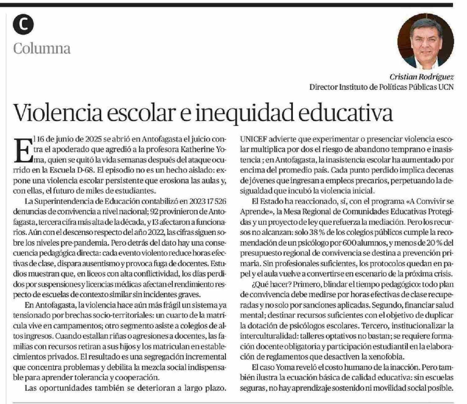 Columnas de Opinión: Violencia escolar e inequidad educativa 22-06-2025 El Mercurio de Antofagasta |
