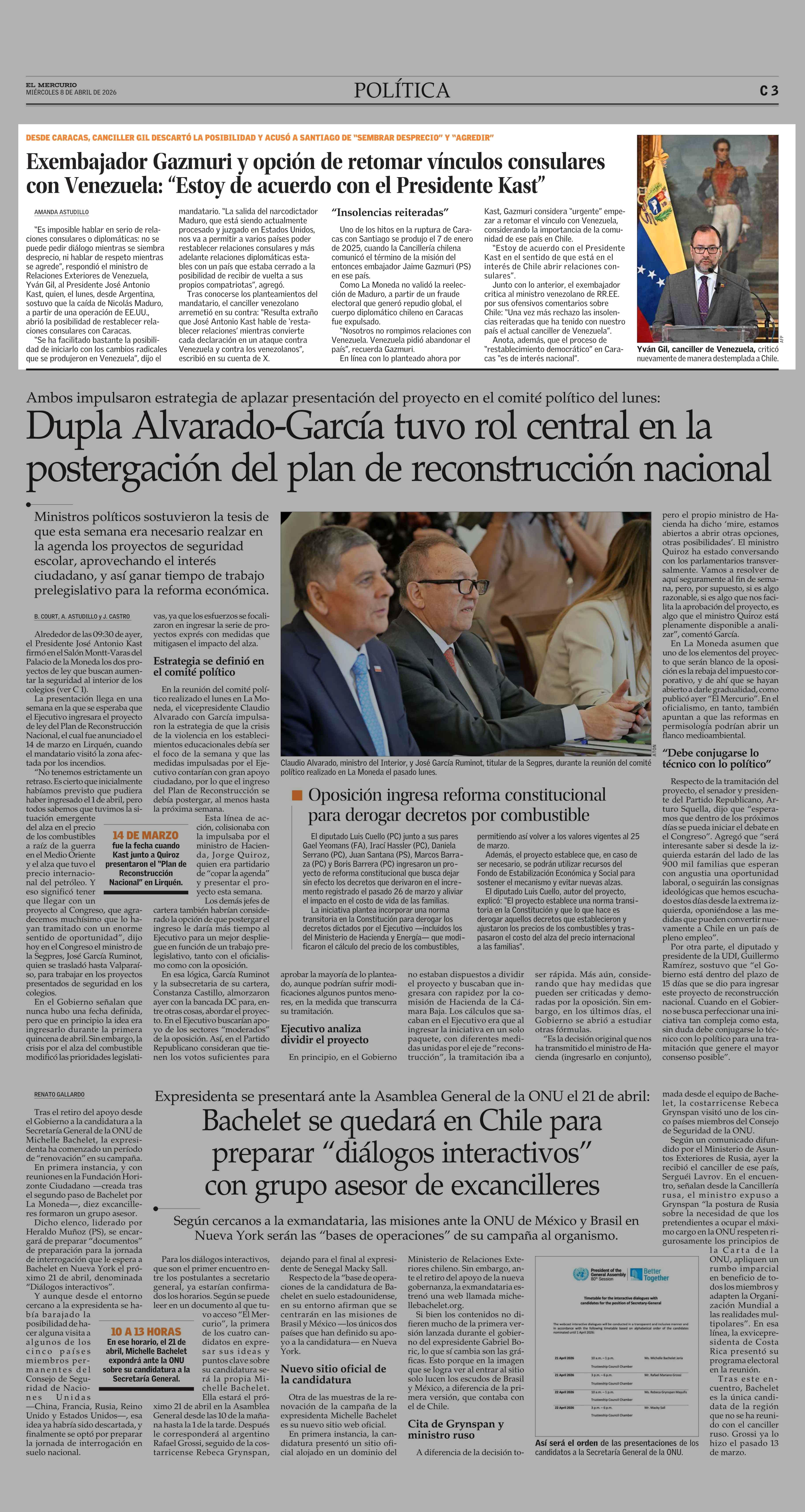 Exembajador Gazmuri y opción de retomar vínculos consulares con Venezuela: “Estoy de acuerdo con el Presidente Kast” 08-04-2026 El Mercurio |