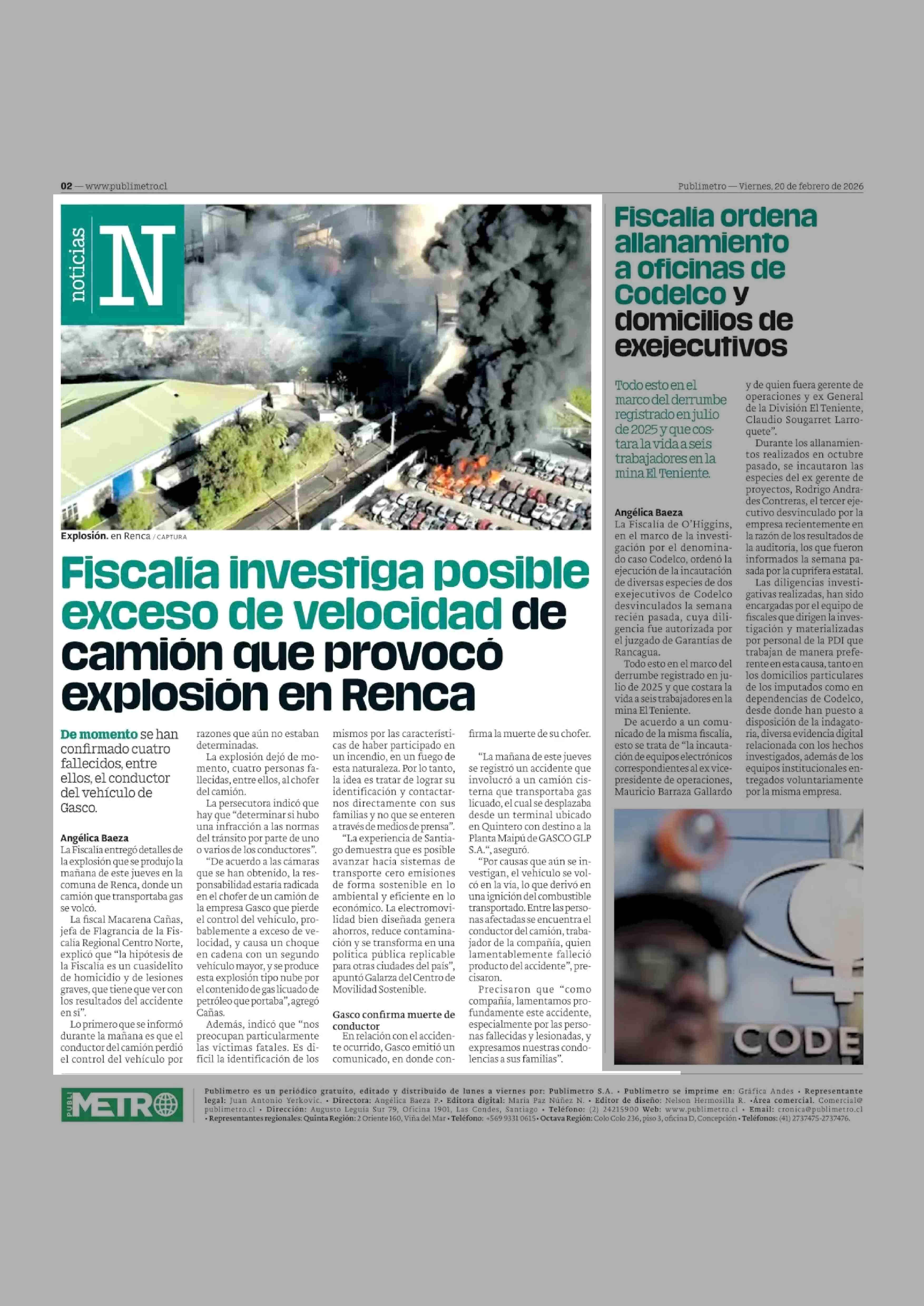 Fiscalia investiga posible exceso de velocidad de camión que provocó explosión en Renca 20-02-2026 Publimetro |