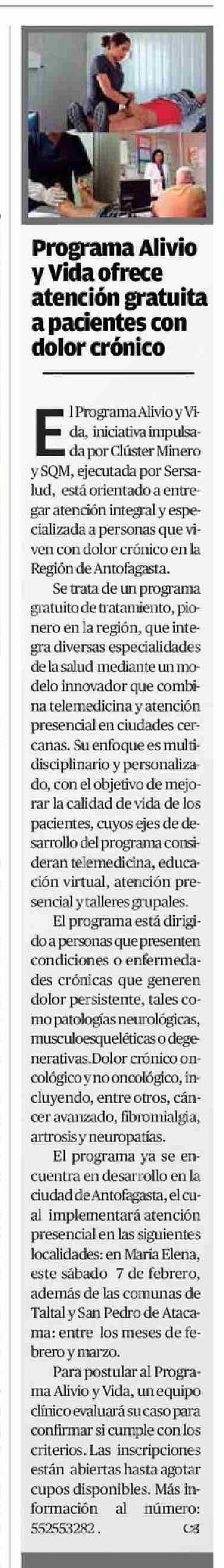 Programa Alivio y Vida ofrece atención gratuita a pacientes con dolor crónico 07-02-2026 El Mercurio de Calama |