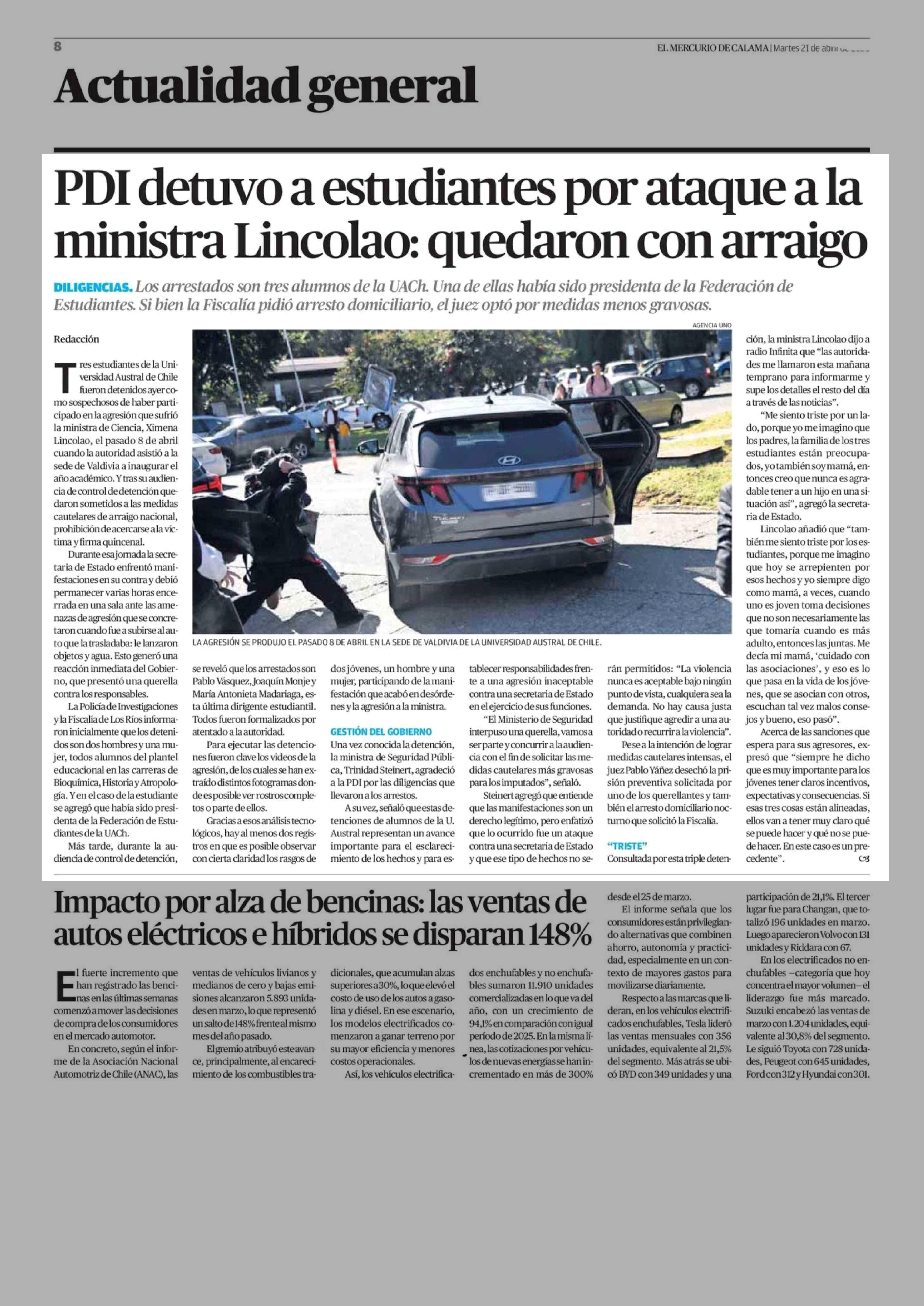 PDI detuvo a estudiantes por ataque a la ministra Lincolao: quedaron con arraigo 21-04-2026 El Mercurio de Calama |