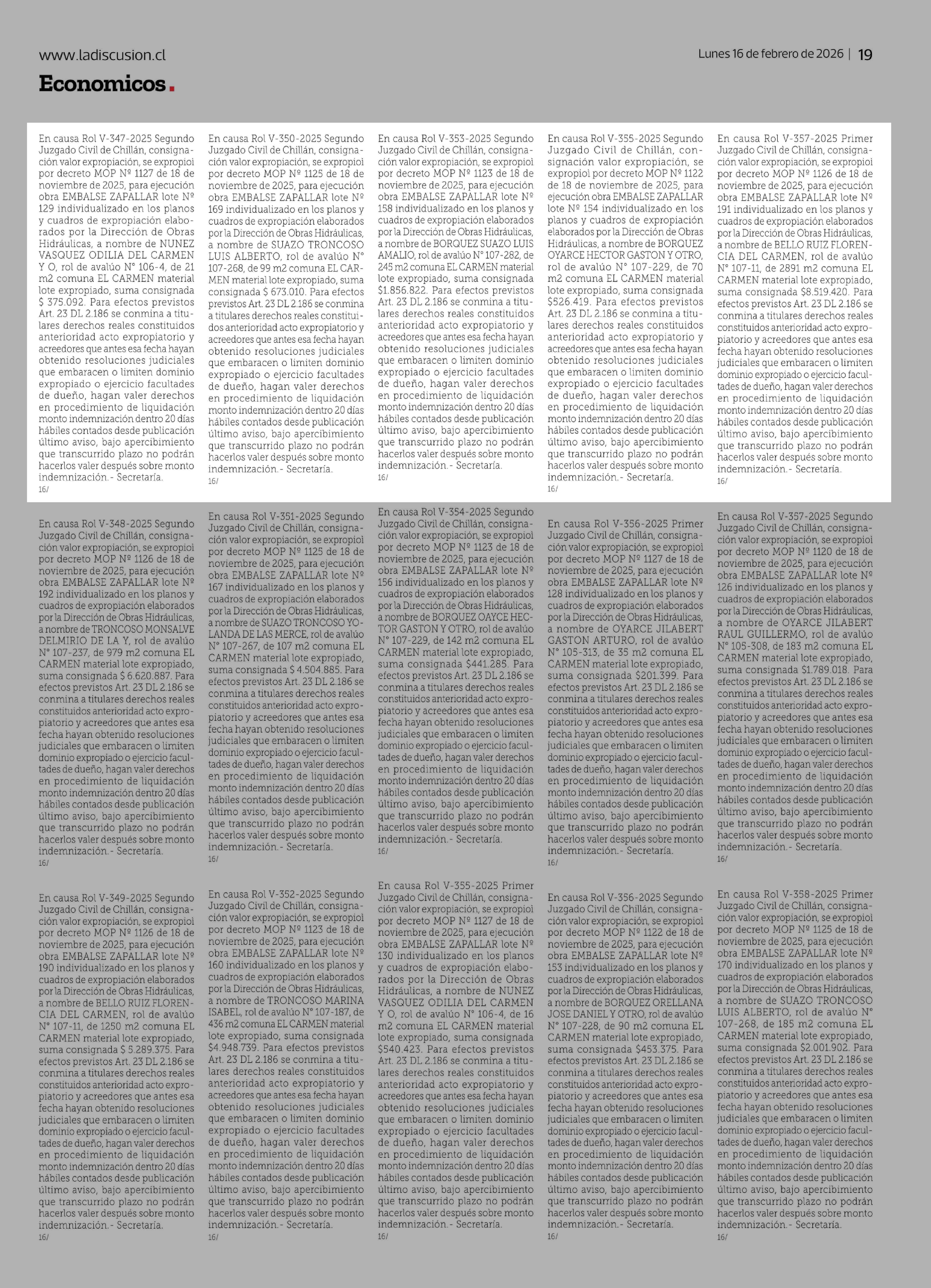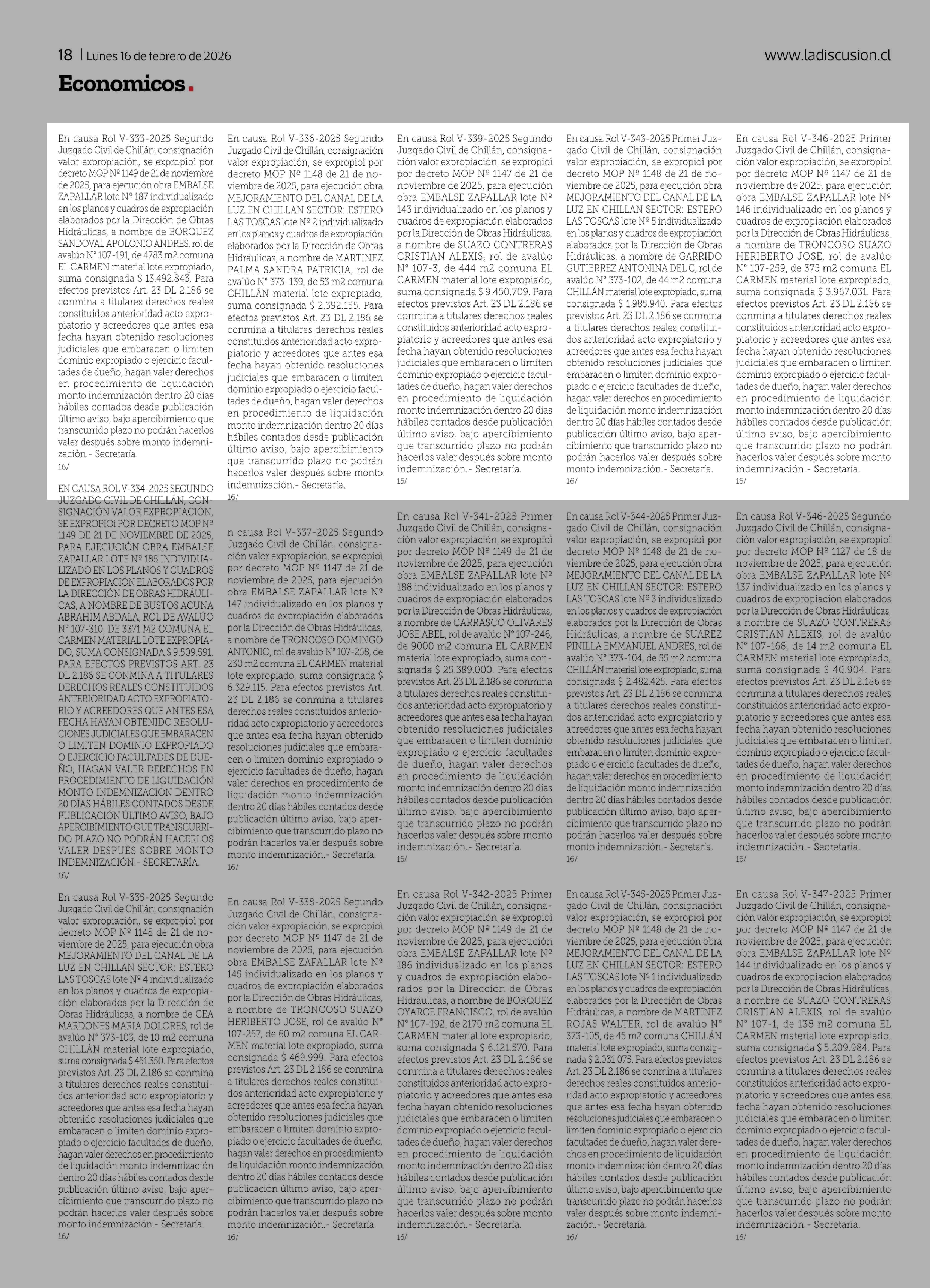 | Título: | En causa Rol V-333-2025 Segundo Juzgado Civil de Chillán, consignación valor expropiación, se expropioì por decreto MOP Nº 1149 de 21 de noviembre de 2025, para ejecución obra EMBALSE ZAPALLAR lote Nº 187 individualizado en los planos y cuadros de expropiación elaborados por la Dirección de Obras Hi |