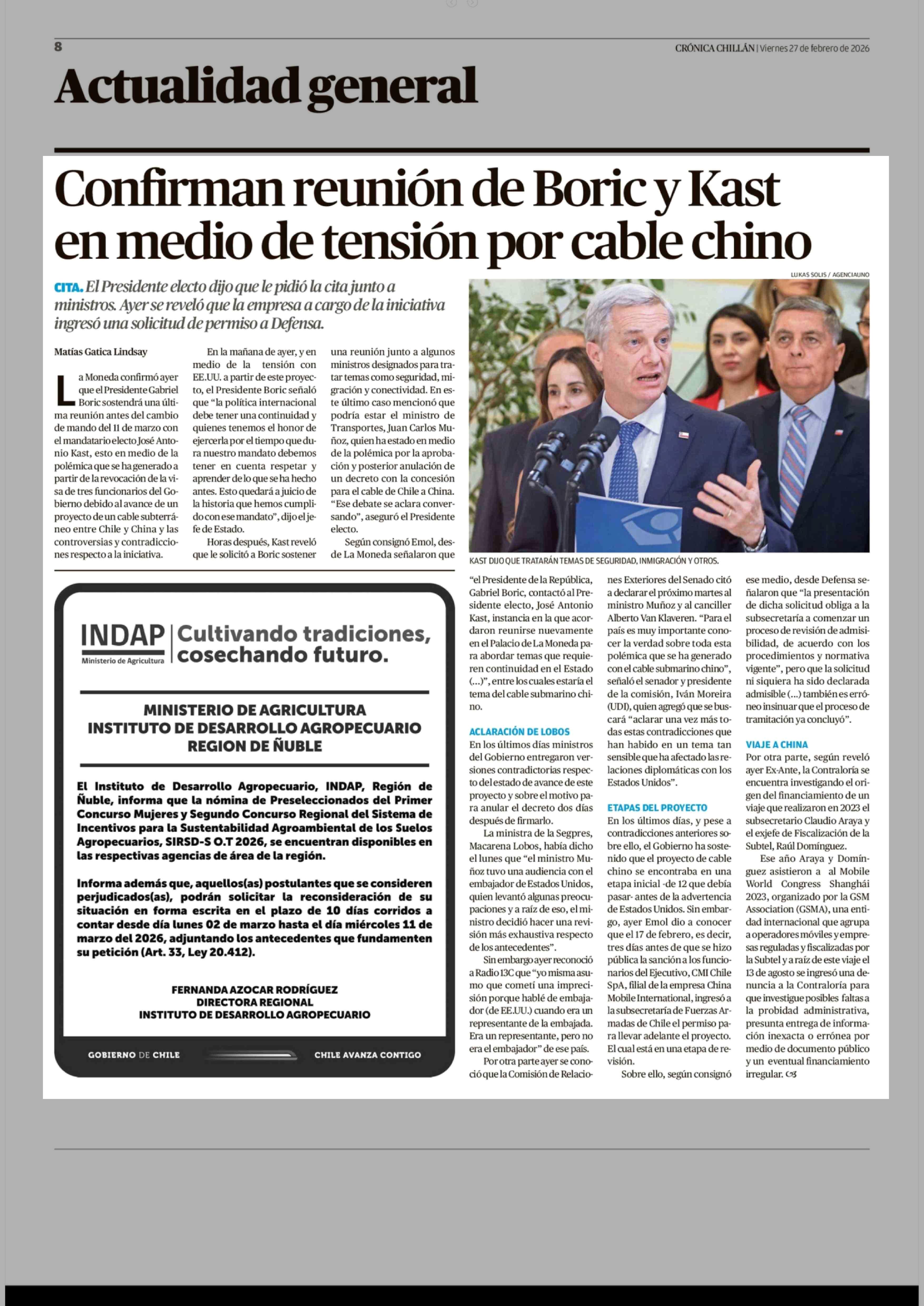 Confirman reunión de Boric y Kast en medio de tensión por cable chino 27-02-2026 Crónica de Chillán |