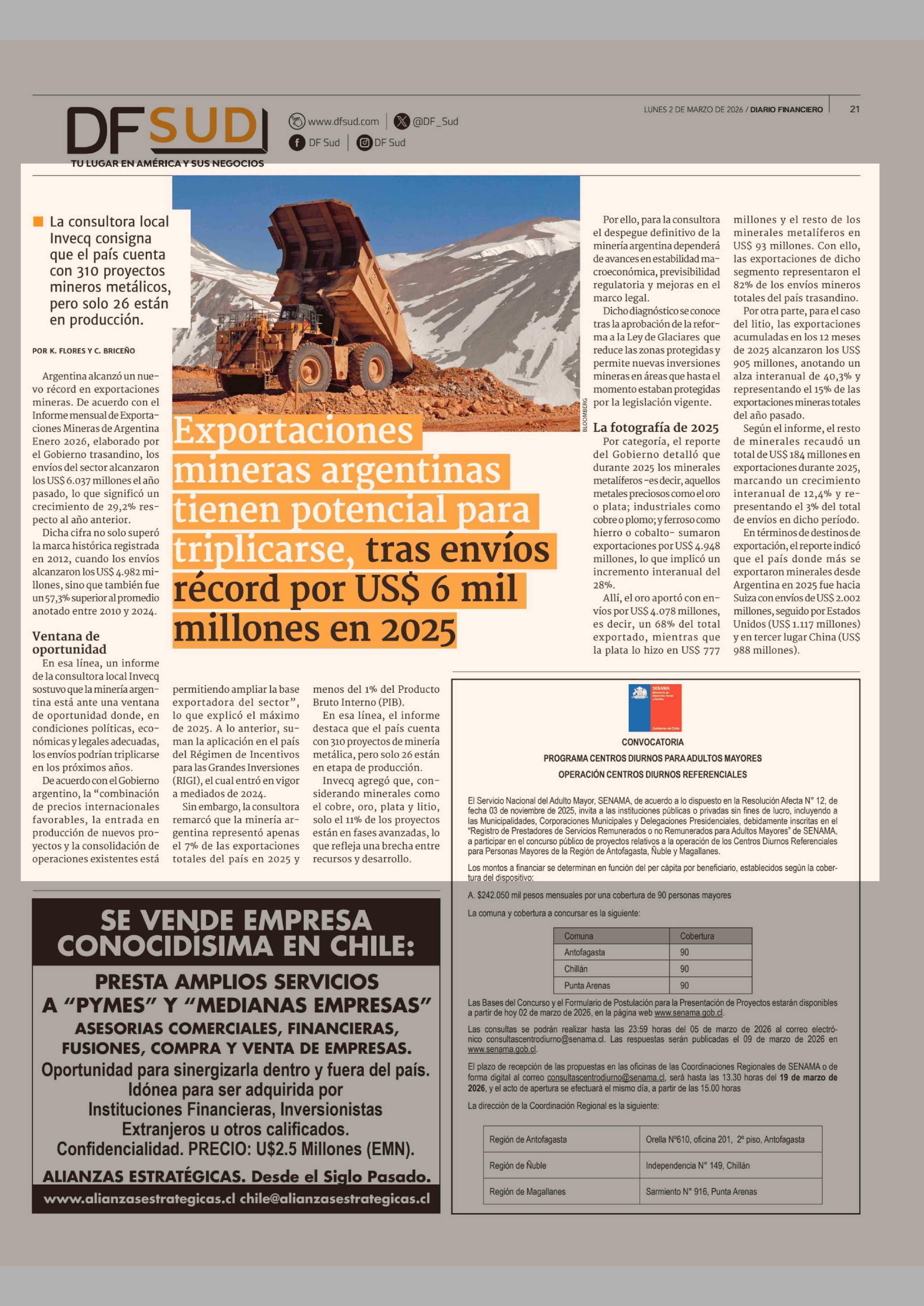 Título: Exportaciones mineras argentinas tienen potencial para triplicarse, tras envíos récord por US$ 6 mil millones en 2025