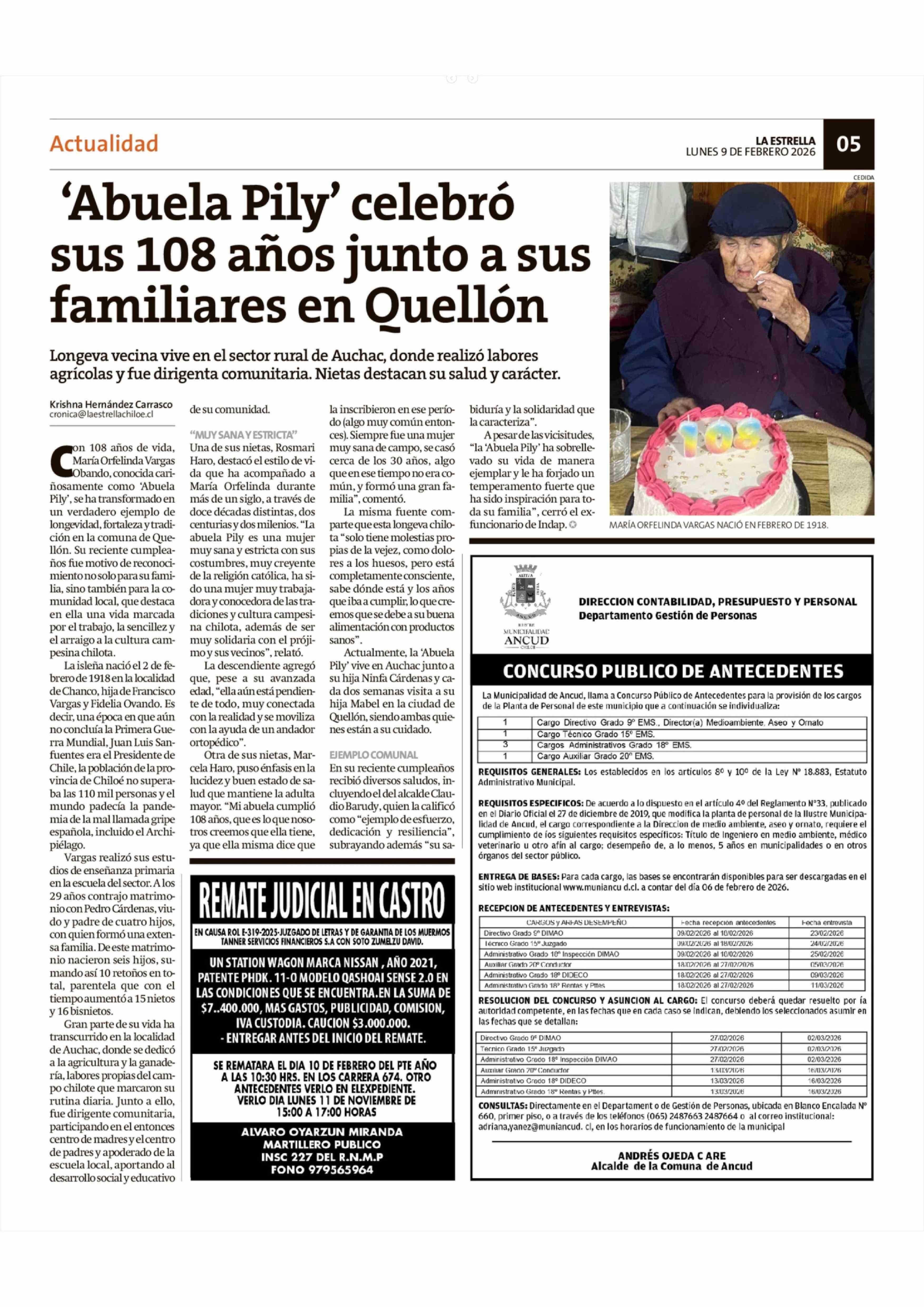 'Abuela Pily' celebró sus 108 años junto a sus familiares en Ouellón 09-02-2026 La Estrella de Chiloé |