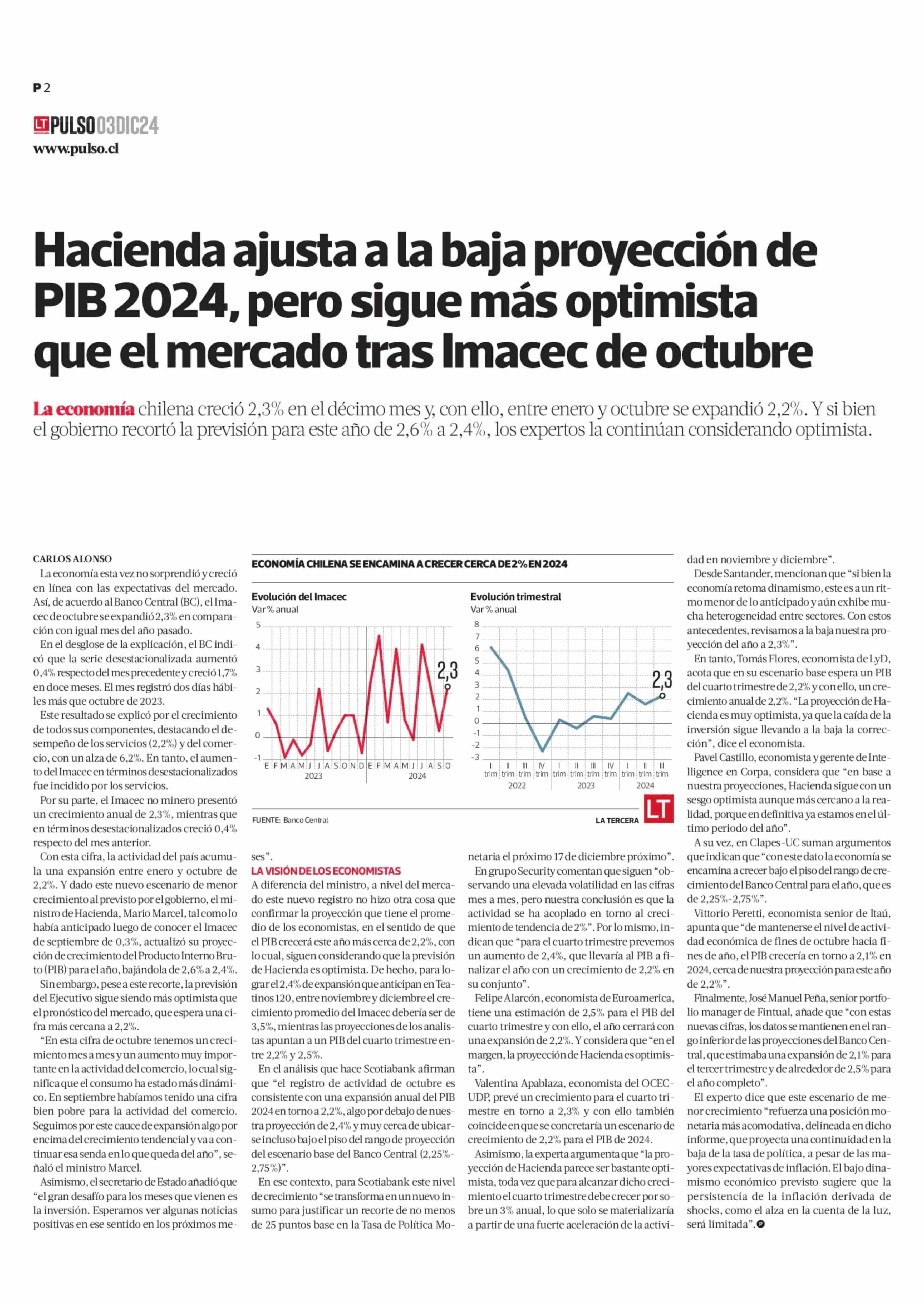 Hacienda ajusta a la baja proyección de PIB 2024, pero sigue más optimista que el mercado tras Imacec de octubre 03-12-2024 La Tercera |