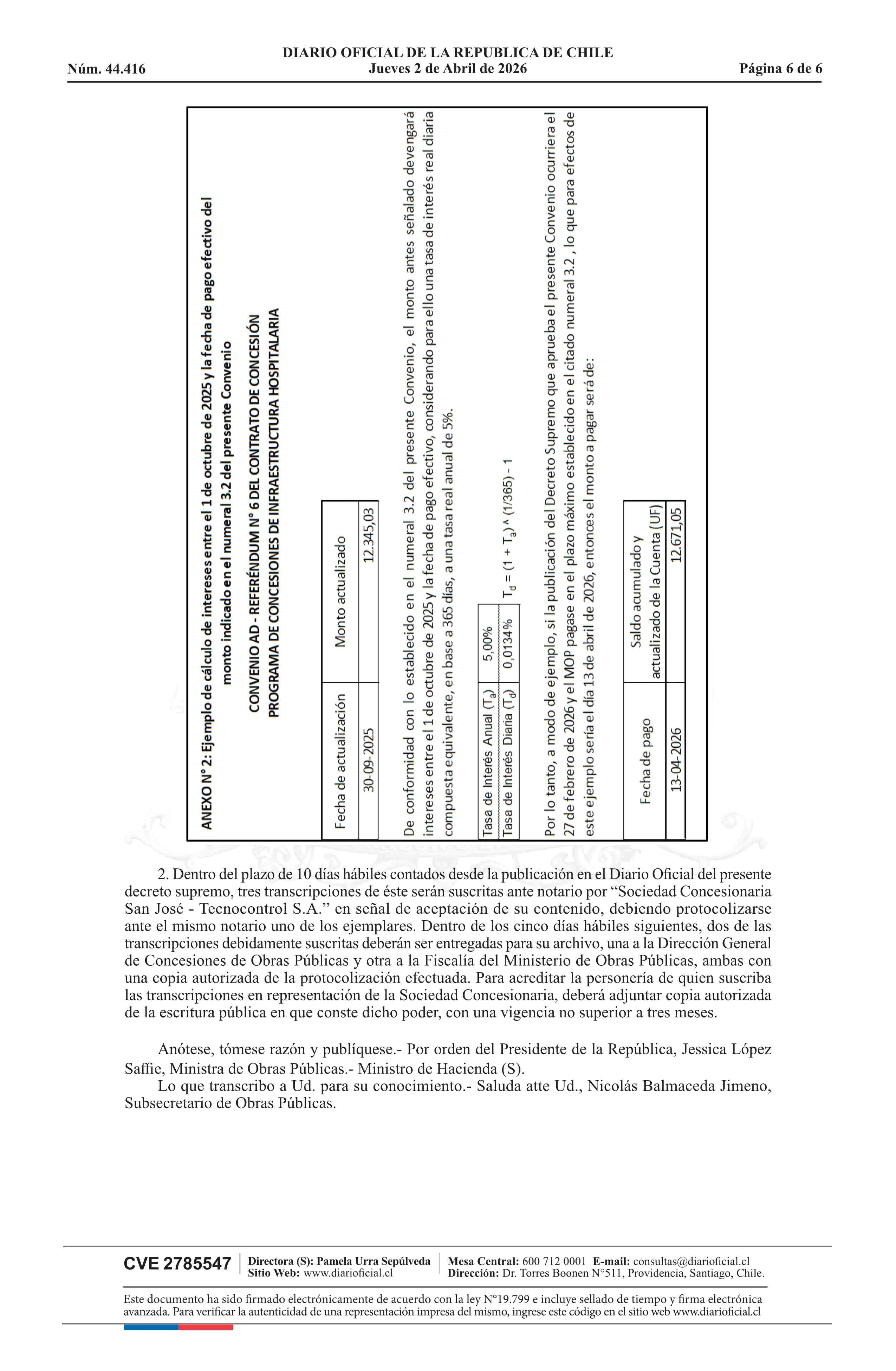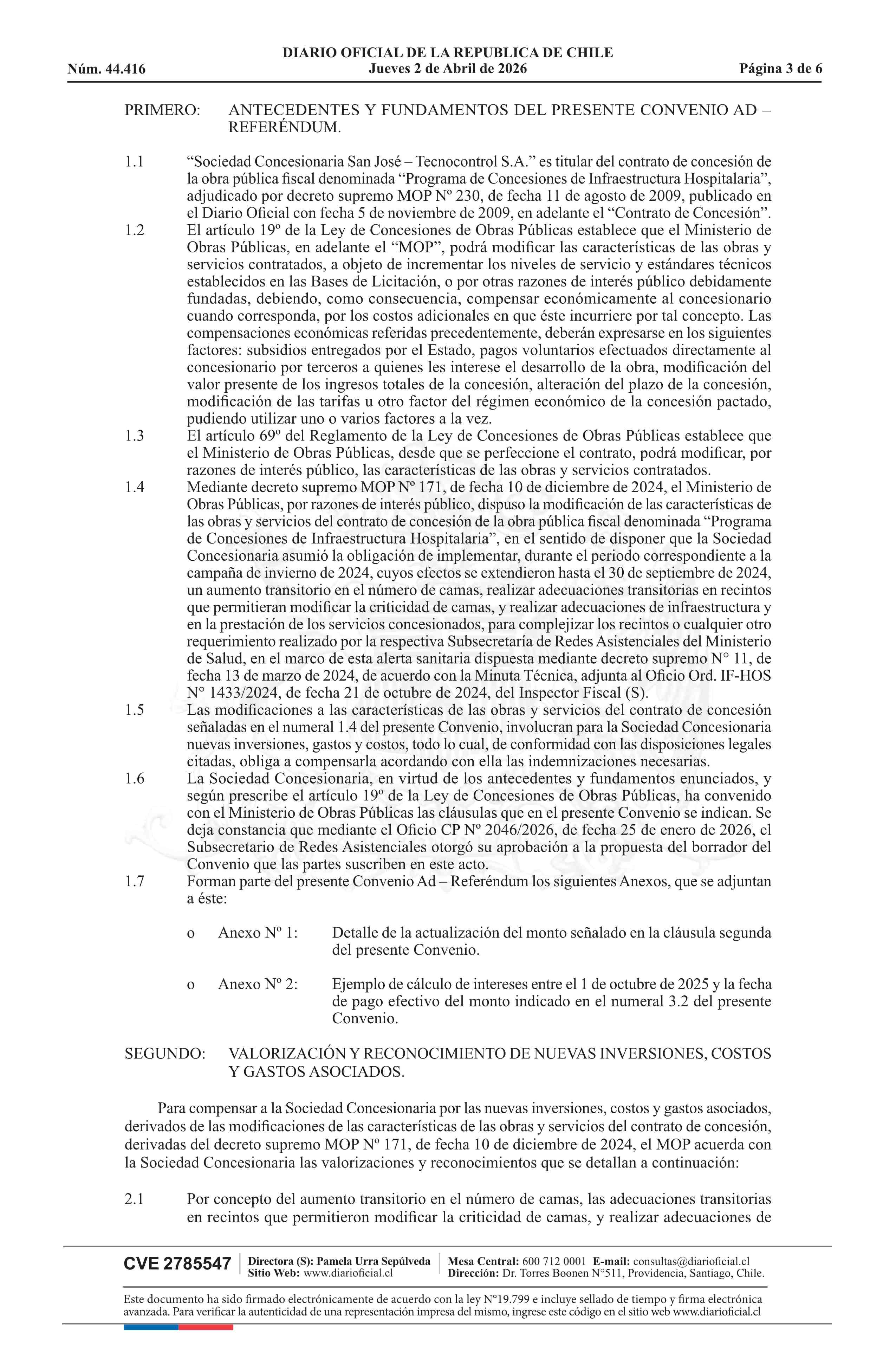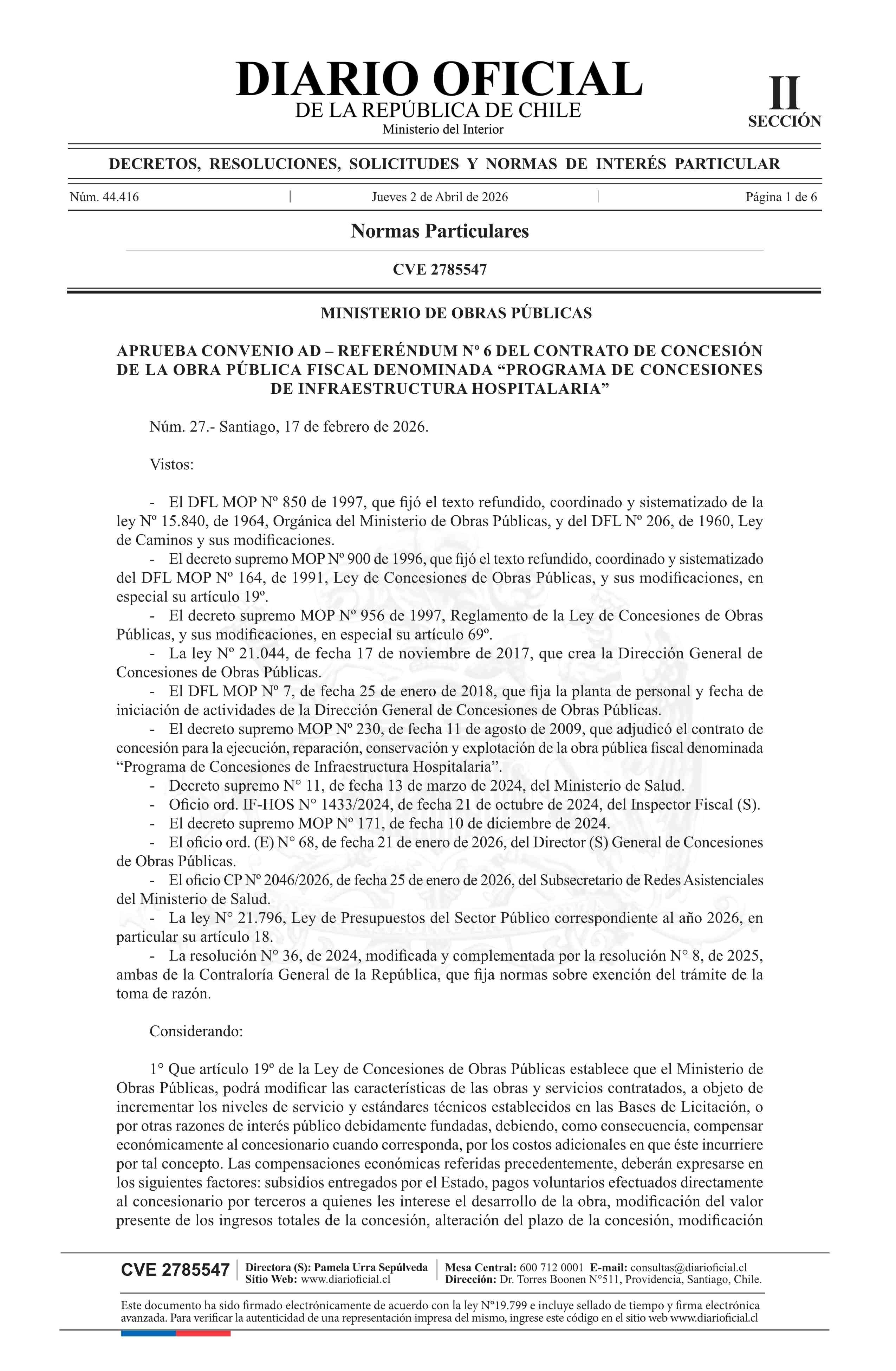 Título: Decreto número 27, de 2026.- Aprueba Convenio Ad - Referéndum N° 6 del contrato de concesión de la obra pública fiscal denominada Programa de Concesiones de Infraestructura Hospitalaria